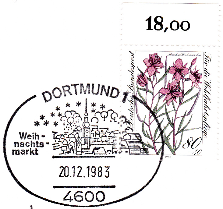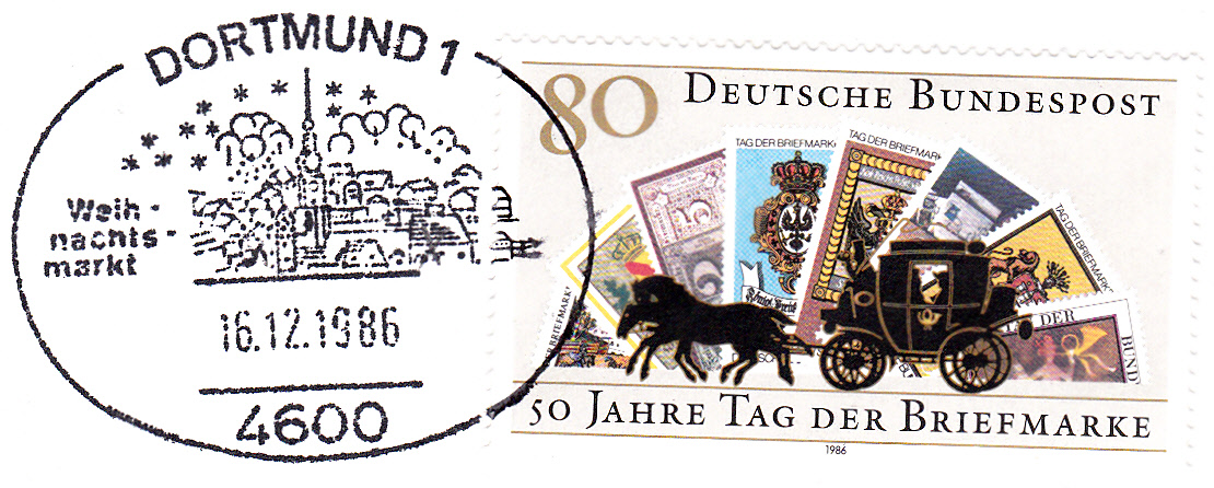 Dieser Stempel vom 20.12.1983 zu Dortmunder Weihnachtsmarkt zeigt das gleiche Stempelbild der bereits gezeigte Stempel vom 23.12.1981 aus Dortmund. Es wurde also über mehrere Jahre das gleiche Motiv verwendet.