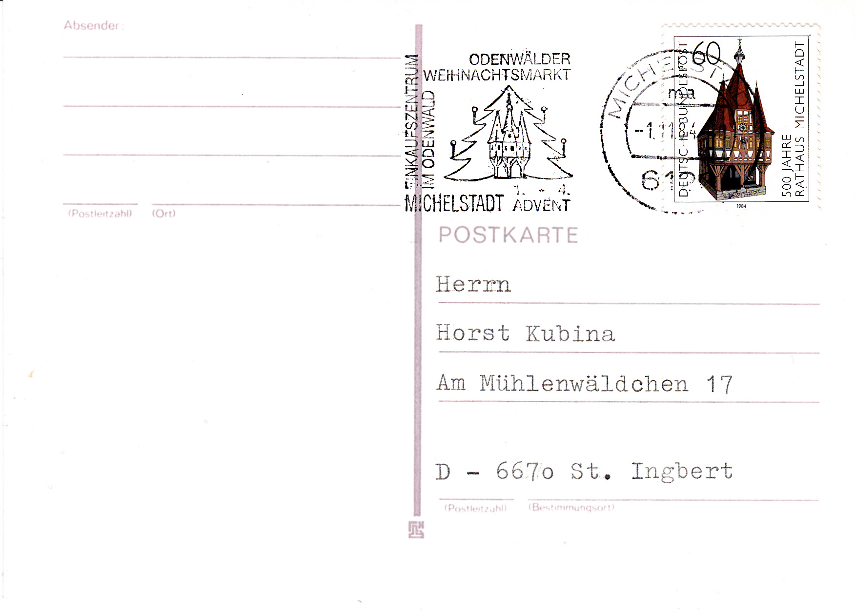 Maschinenwerbestempel vom 1.11.1984 aus Michelstadt mit Werbung für den Odenwälder Weihnachtsmarkt in Michelstadt.