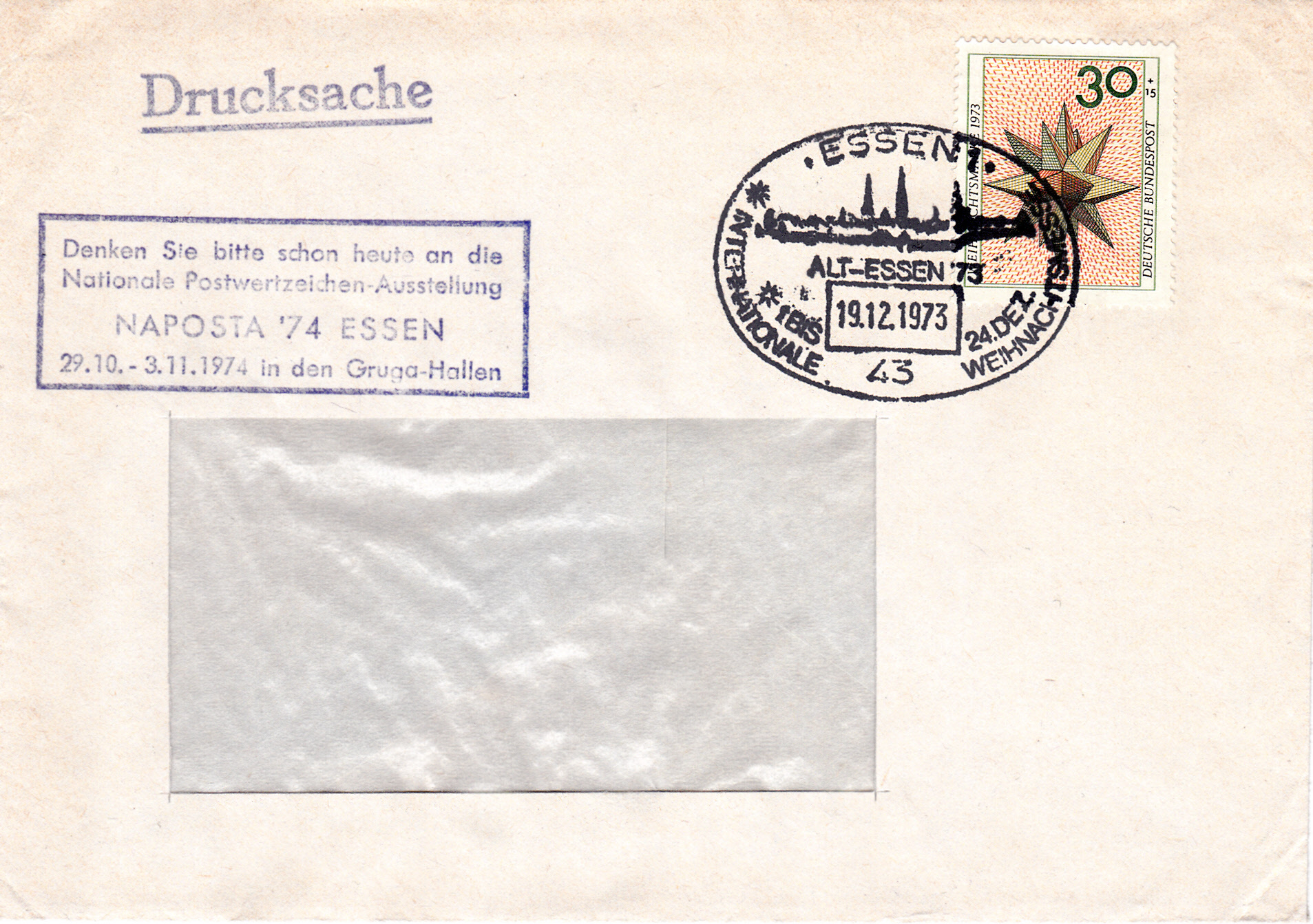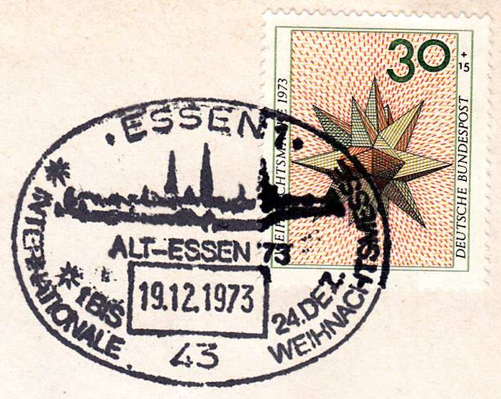 Sonderstempel aus Essen vom 19.12.1973 zur Internationalen Weihnachtsmesse in Essen. Er hat das Motiv wie der bereits gezeigte Stempel vom 18.12.1989 zum 17. Internationalen Weihnachtsmarkt in Essen nur in einer etwas anderen Zeichnung (mehr schwarz).
