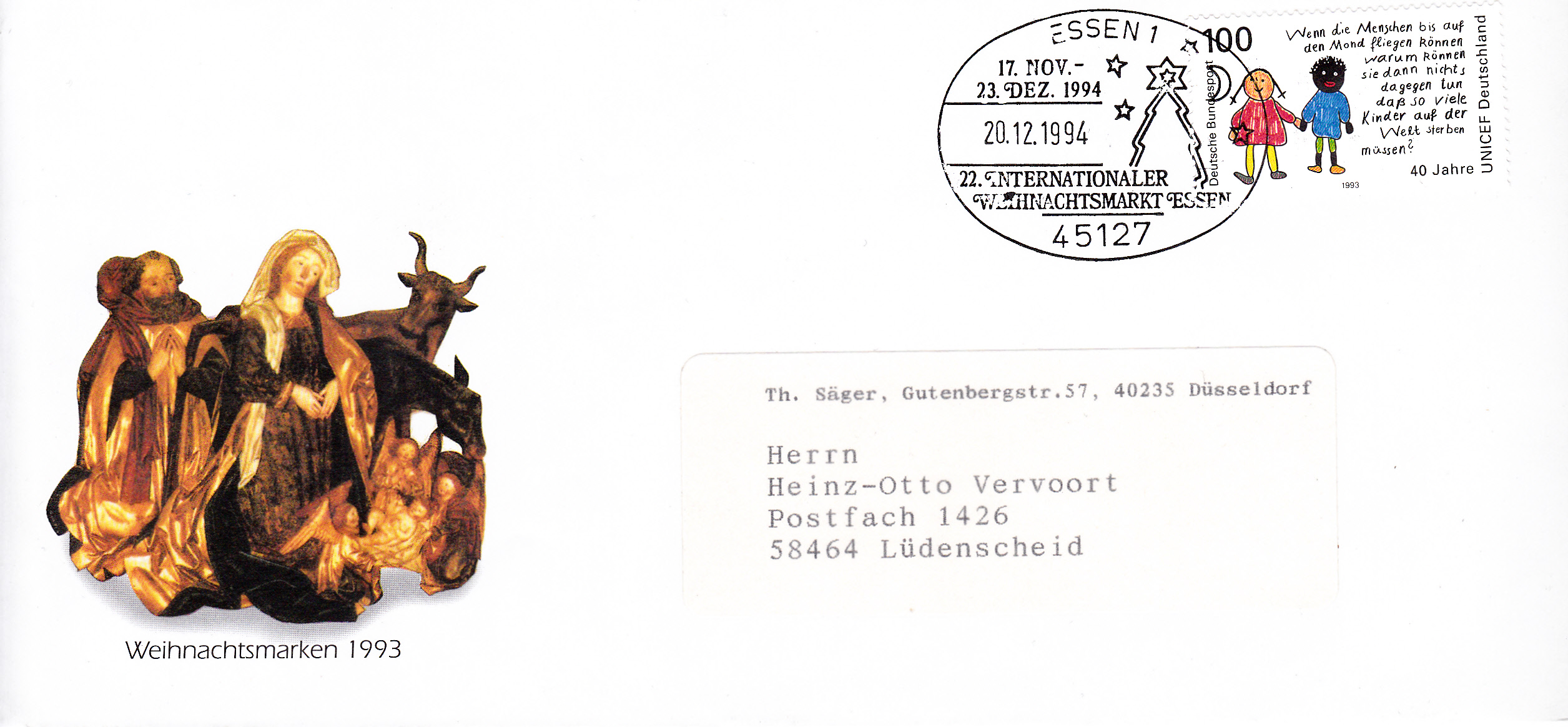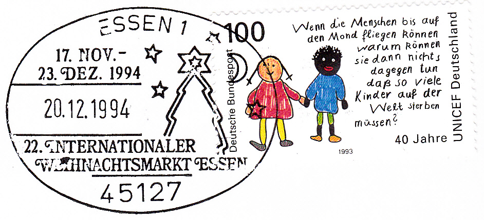 Der Sonderstempel zu 22. Internationalen Weihnachtsmarkt in Essen vom 20.12.1994 zeigt einen stilisierten Weihnachtsbaum.