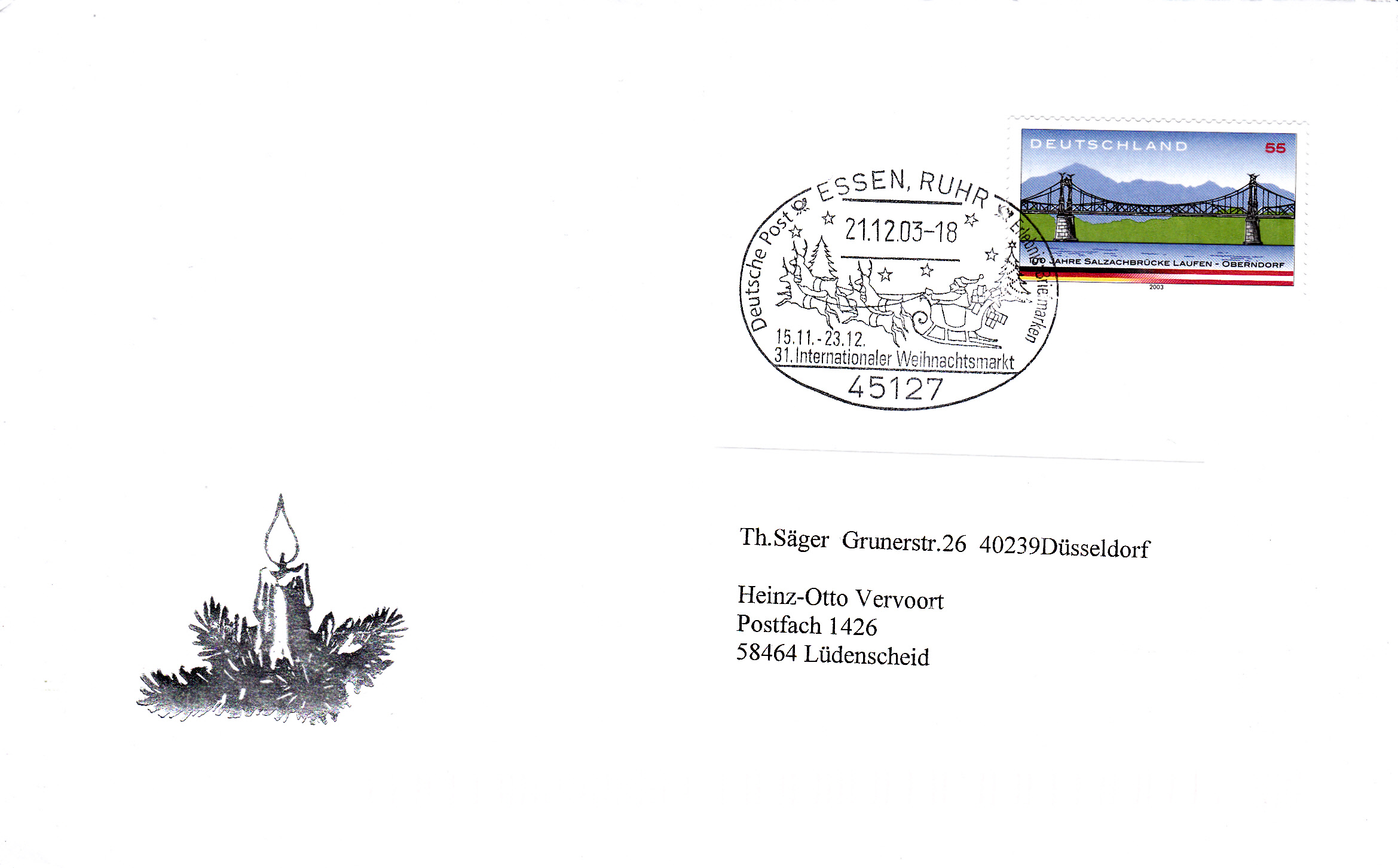 Hier noch ein weiterer Sonderstempel aus Essen, jetzt vom 21.12.2003 zum 31. Internationalen Weihnachtsmarkt. Im Stempelbild wird der Weihnachtsmann in seinem Rentierschlitten gezeigt.