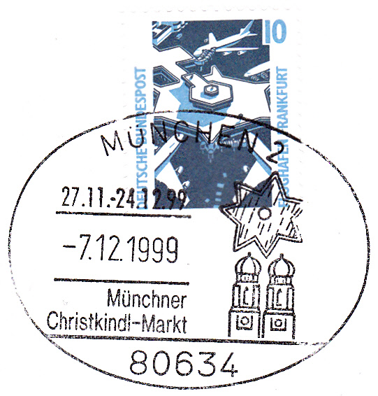 Dieser Sonderstempel vom 7.12.1999 zum Christkindl-Markt in München unterscheidet sich von bereits gezeigten Stempel nur durch das Jahr und die Postleitzahl.