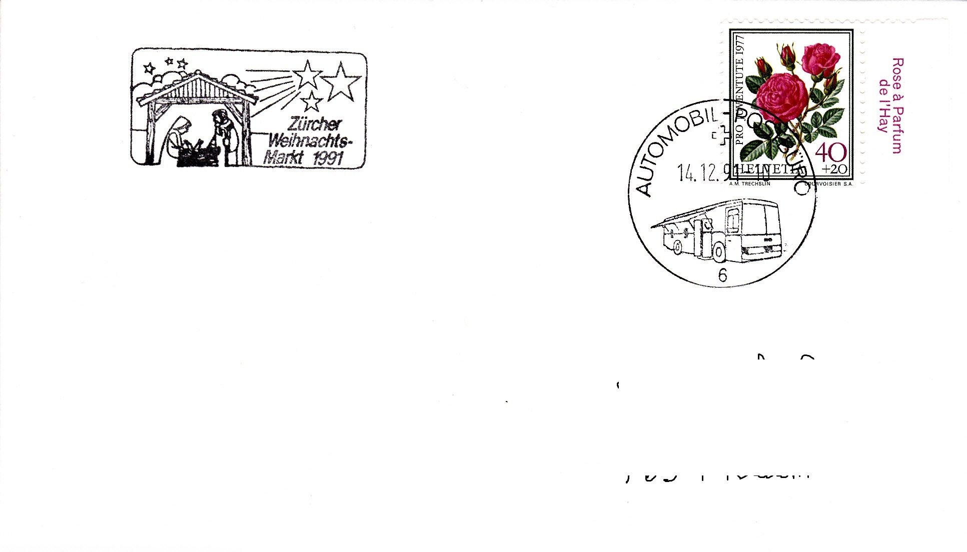 Auf dem Züricher Weihnachtsmarkt wurde Post bei einem Automobil-Postbüro angenommen und auch mit einem Zusatzstempel zum Züricher Weihnachtsmarkt 1991 versehen, wie dieser Beleg zeigt.