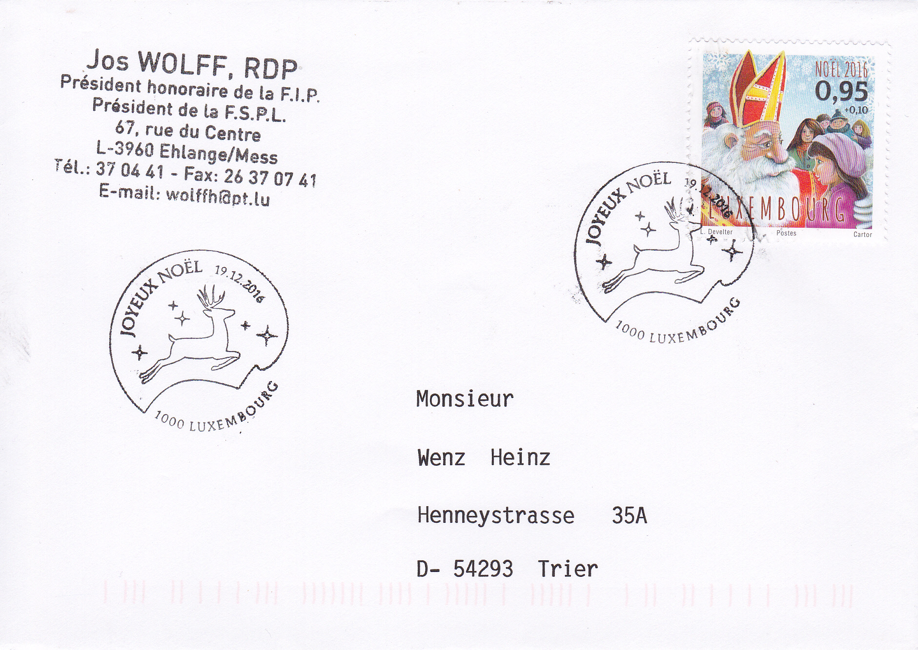 In Luxemburg sind auch 2016 wieder am 6.12. Weihnachtsmarken erschienen. Hier die Marke zu 0,70+0,05 € (MiNr 2107) mit einem Nikolaus und einem Kind im Markenbild.