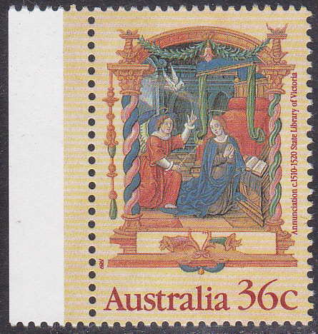 Die Marke zu 36 Cent zeigt eine Illustration zu "Mariä Verkündigung". Hier eine vierseitig gezähnte Marke (MiNr 1177 A) aus dem Bogen.
