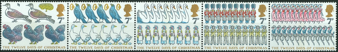 In Neuseeland sind 1986 auch drei Weihnachtsmarken mit Illustrationen zum Weihnachtslied "The Twelve Days of Christmas" erschienen. Hier die erste Marke (MiNr 971) mit der Illustration zum ersten Tag "Rebhuhn im Birnbaum".