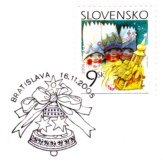 In der Slowakei erschien am 16.11.2005 diese Weihnachtsmarke (MiNr 525) mit Kindern in Verkleidung als Heilige Drei Könige und mit einer Weihnachtskrippe.