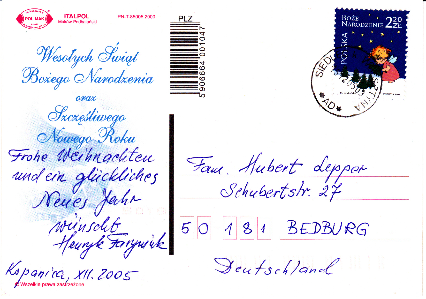 Die Weihnachtsmarke 2005 zu 2,20 Zloty aus Polen (MiNr 4226) zeigt uns einen Weihnachtsbäume pflückenden Engel.