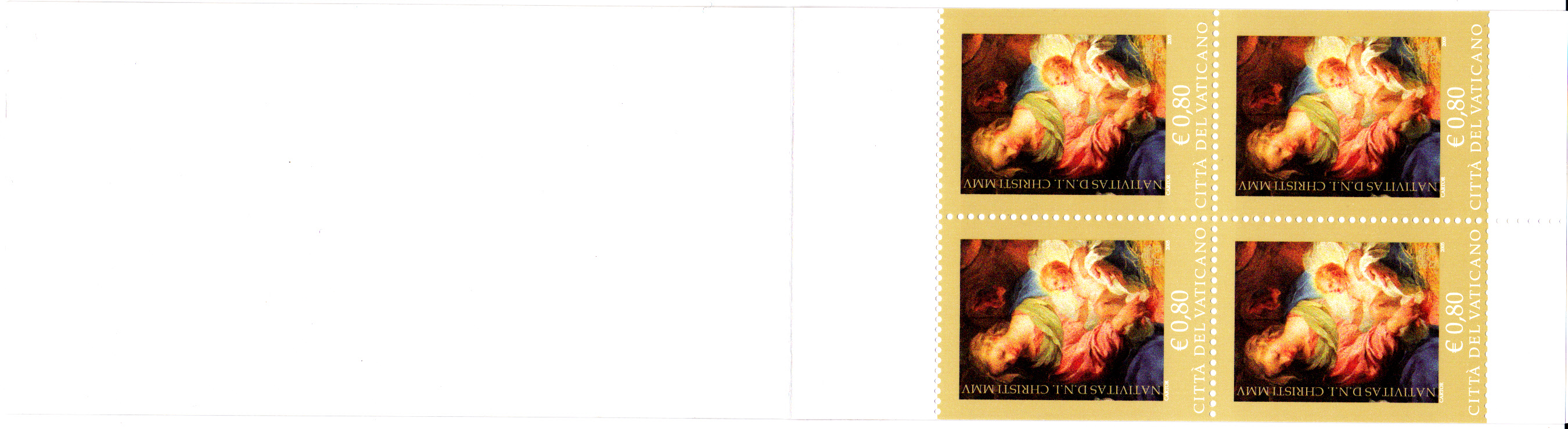Im Vatikan erschien eine der drei 2005 verausgabten Weihnachtsmarken (Wert zu 80 Cent) auch im Markenheftchen. Das Heftchenblatt (MiNr H-Blatt 22) enthält vier Werte der dreiseitig gezähnten Marke (2x 1542 Dl und 2x 1542 Dr). Das Markenbild zeigt ein Detail des Gemäldes "Anbetung der Hirten" von François Le Moyne (1688-1737, französischer Maler).