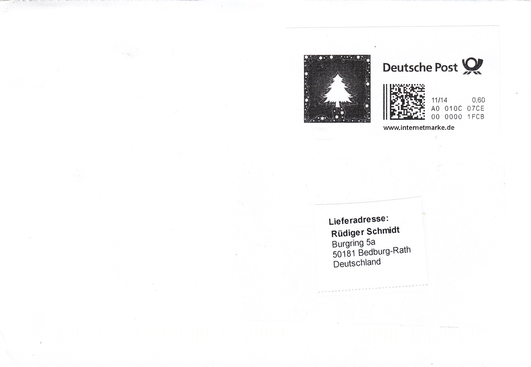 Aus meinem aktuellen Posteingang stammt diese Internetmarke mit diesem Tannenbaum als Weihnachtsmotiv, leider nur in Schwarzweiß ausgedruckt: