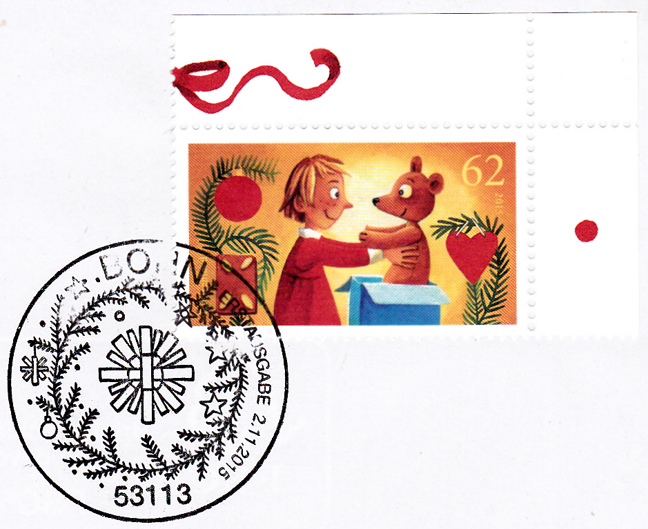 Im Ersttagsonderstempel der Marke zum Thema "Freude schenken" (MiNr 3185) wird ein Strohstern im Stempelbild gezeigt. Strohsterne werden häufig als Weihnachtsbaumschmuck benutzt. Am kreisförmigen Tannenzweig hängt auch Weihnachtsbaumschmuck.