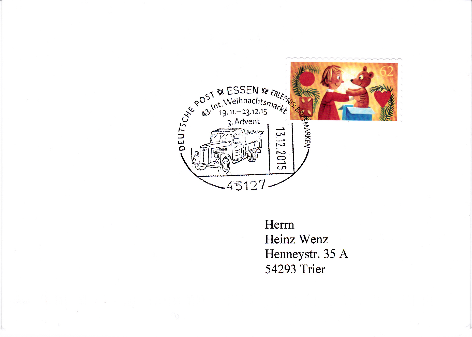 Sonderstempel aus Essen vom 13.12.2015 (3.Advent) zum Essener Weihnachtsmarkt mit der Abbildung "Historischer Oldtimer 'Opel Blitz'-LKW mit Weihnachtsmann am Steuer" (so die Beschreibung durch das Informationsblatt der Deutschen POSTPHILATELIE). Da ich den Weihnachtsmann auf dem Stempel nicht als Fahrer erkennen kann, zeige ich den Stempel hier unter dem Thema "Weihnachtsbaum", der deutlich auf dem LKW liegend zu sehen ist.