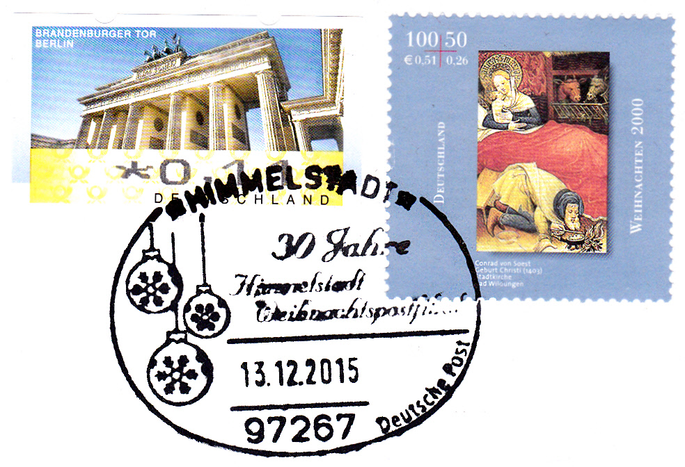 In diesem Sonderstempel vom 13.12.2015 aus Himmelstadt zu "30 Jahre Himmelstadt Weihnachtspostfiliale" werden der Christbaumkugel gezeigt.