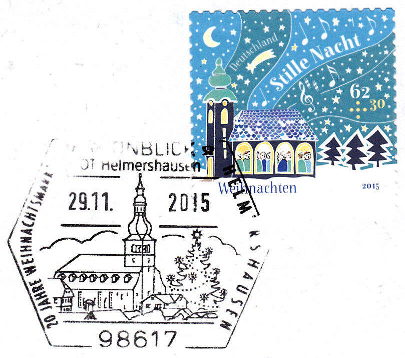 Sonderstempel vom 29.11.2015 aus Rhönblick zum Jubiläum "20 Jahre Weihnachtsmarkt in Helmershausen". Im Stempelbild Stempelbild wird ein Weihnachtsbaum vor der Dorfkirche gezeigt.