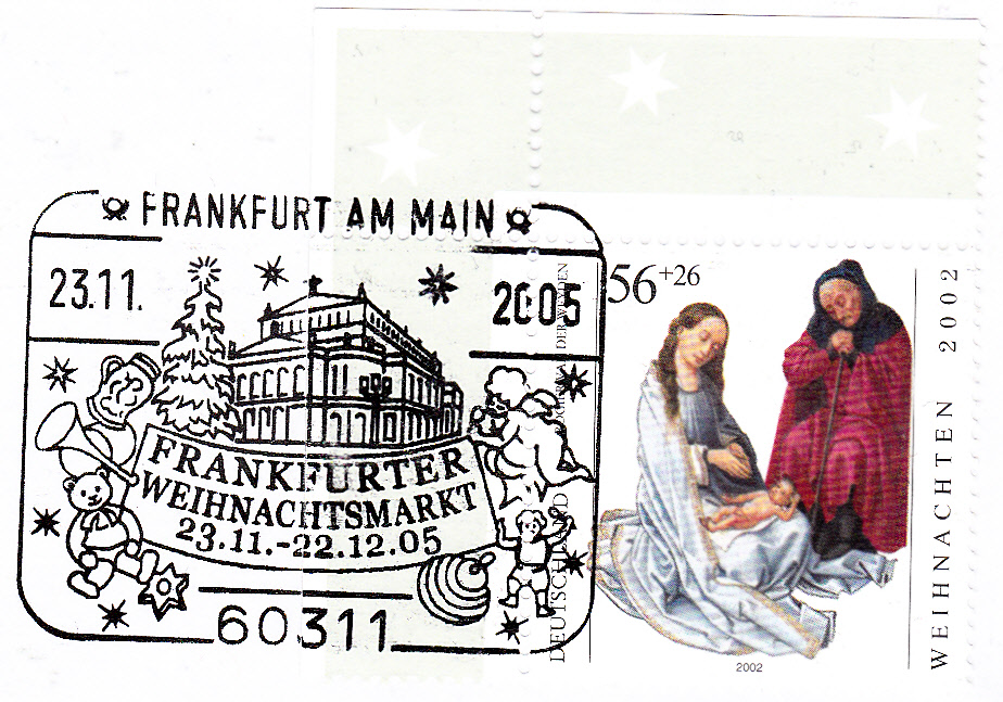 Im Sonderstempel zum Frankfurter Weihnachtsmarkt vom 23.11.2005 steht neben der Alten Oper ein Weihnachtsbaum.
