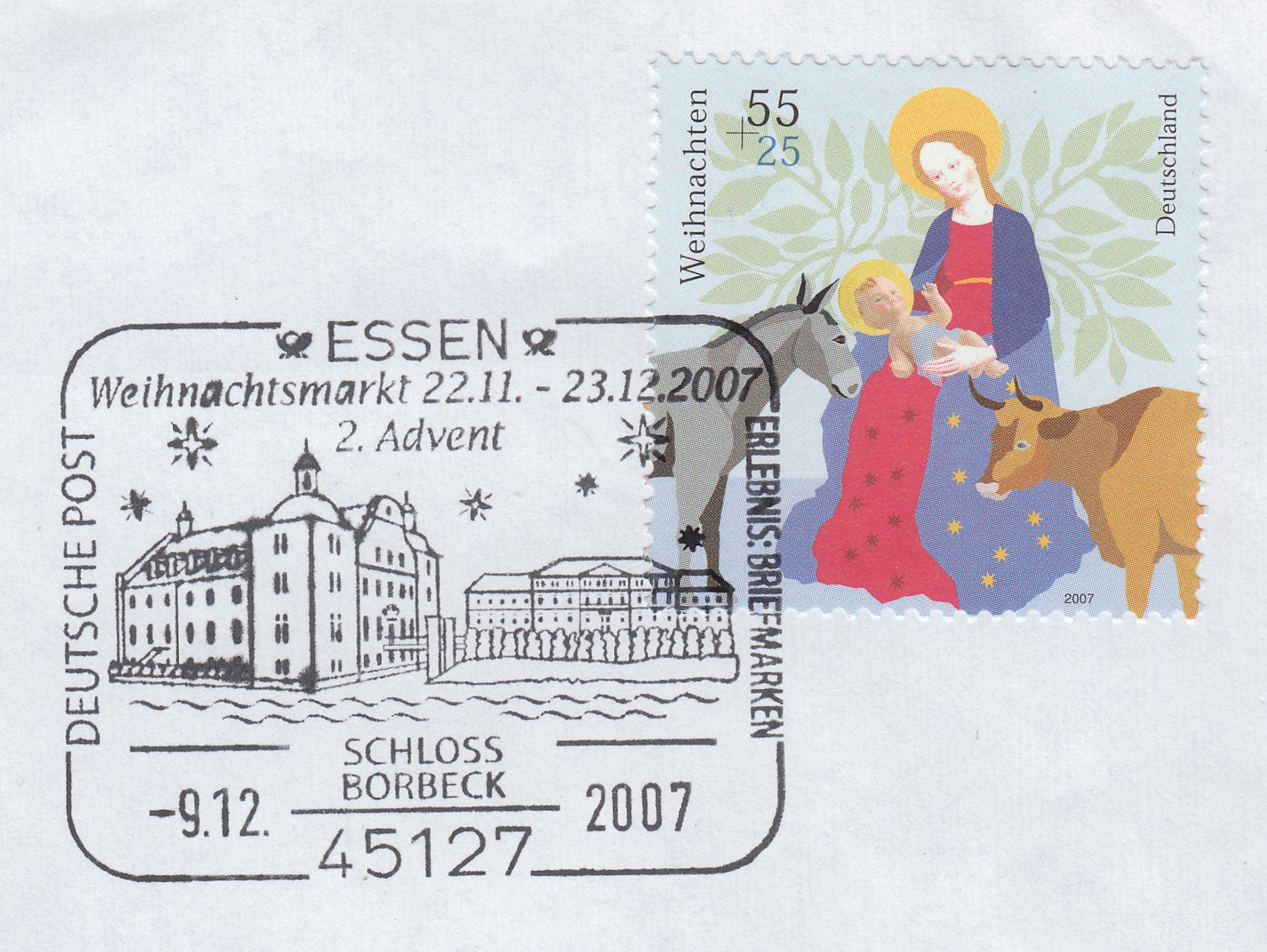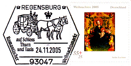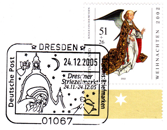 Diesen Stempel zum Frankfurter Weihnachtsmarkt vom 23.11.2005 habe ich bereits auf der ersten Seite im 4.Beitrag gezeigt. Bei dem jetzt hier gezeigten Stempel handelt es sich aber wohl um eine aufgedruckte und nicht gestempelte Variante des "Stempels". Wenn man genau hinschaut, sieht man, dass bei den kleinen Sternen die Mitte weiß erscheint, bei der anderen Version aber schwarz. Der jetzt gezeigte Stempel stammt von einem Umschlag einer Aussendung der Deutschen Post AG NL Philatelie in 92624 Weiden.