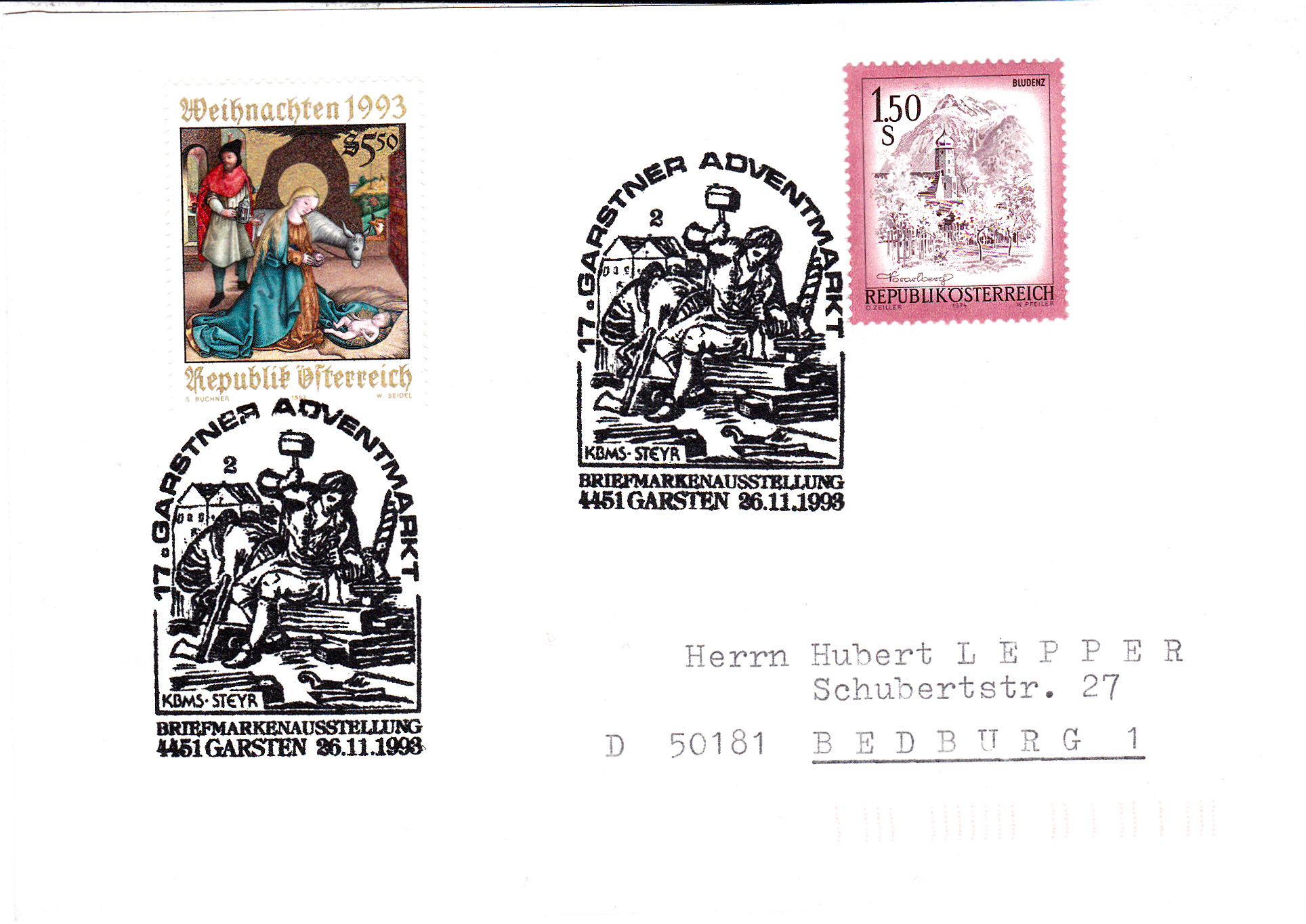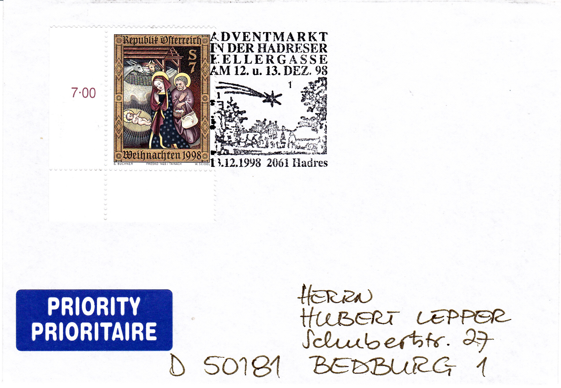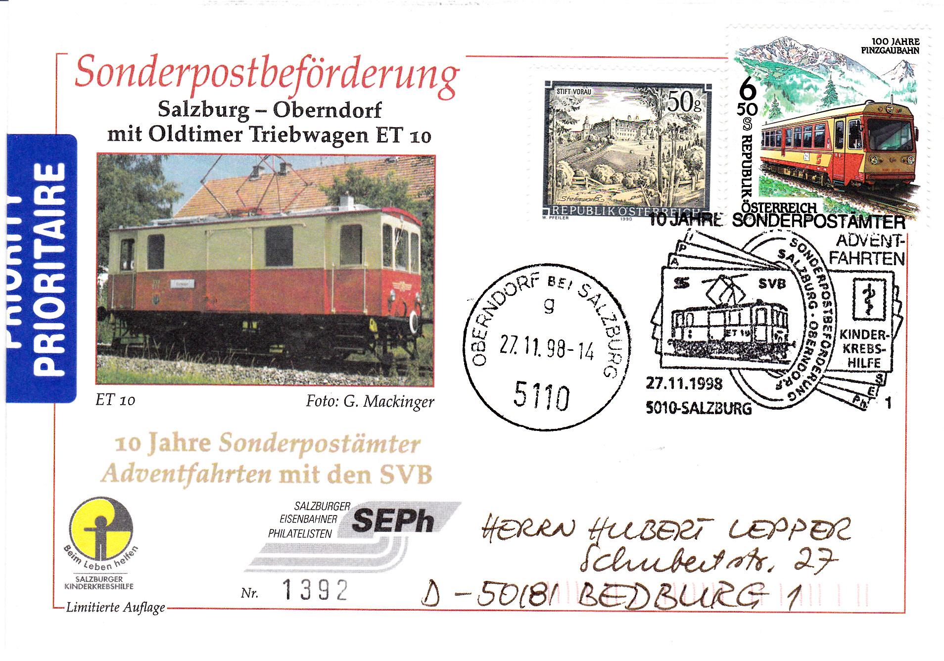 Dieser Brief wurde mit der Sonderpostbeförderung bei der Adventsfahrt am 27.11.1968 von Salzburg nach Oberndorf befördert und mit dem Sonderstempel "10 Jahre Sonderpostämter Adventfahrten" mit der Kennziffer abgestempelt.