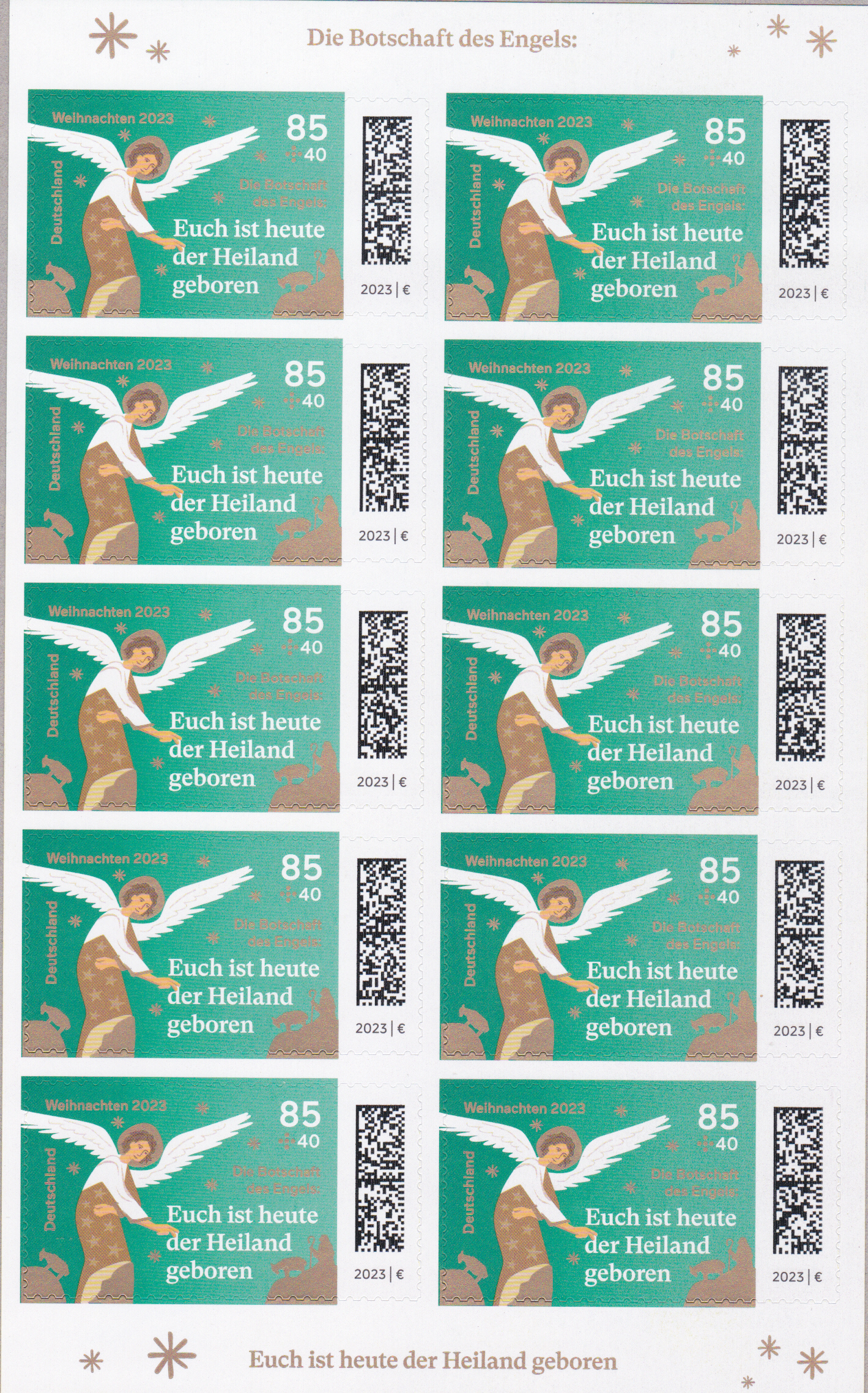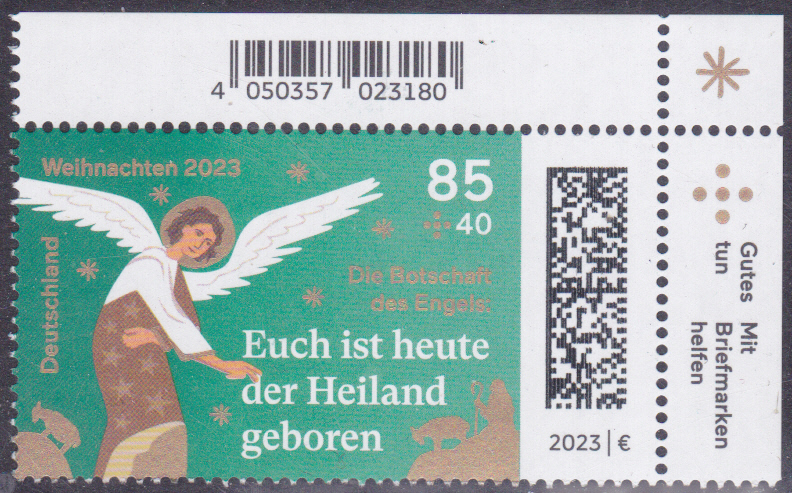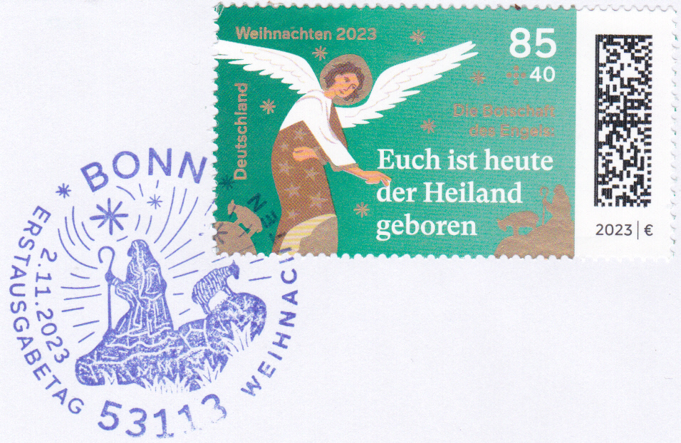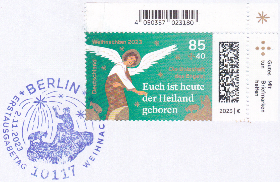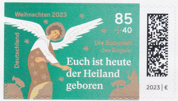 Die Weihnachtsmarke 2023 der Deutschen Post (MiNr 3793) zum Thema "Botschaft des Engels" zeigt die Abbildung "Euch ist heute der Heiland geboren" (Verkündigung an die Hirten) nach einer Miniatur im Perikopenbuch Heinrichs II., entstanden zwischen 1007 und 1012 im Kloster Reichenau.