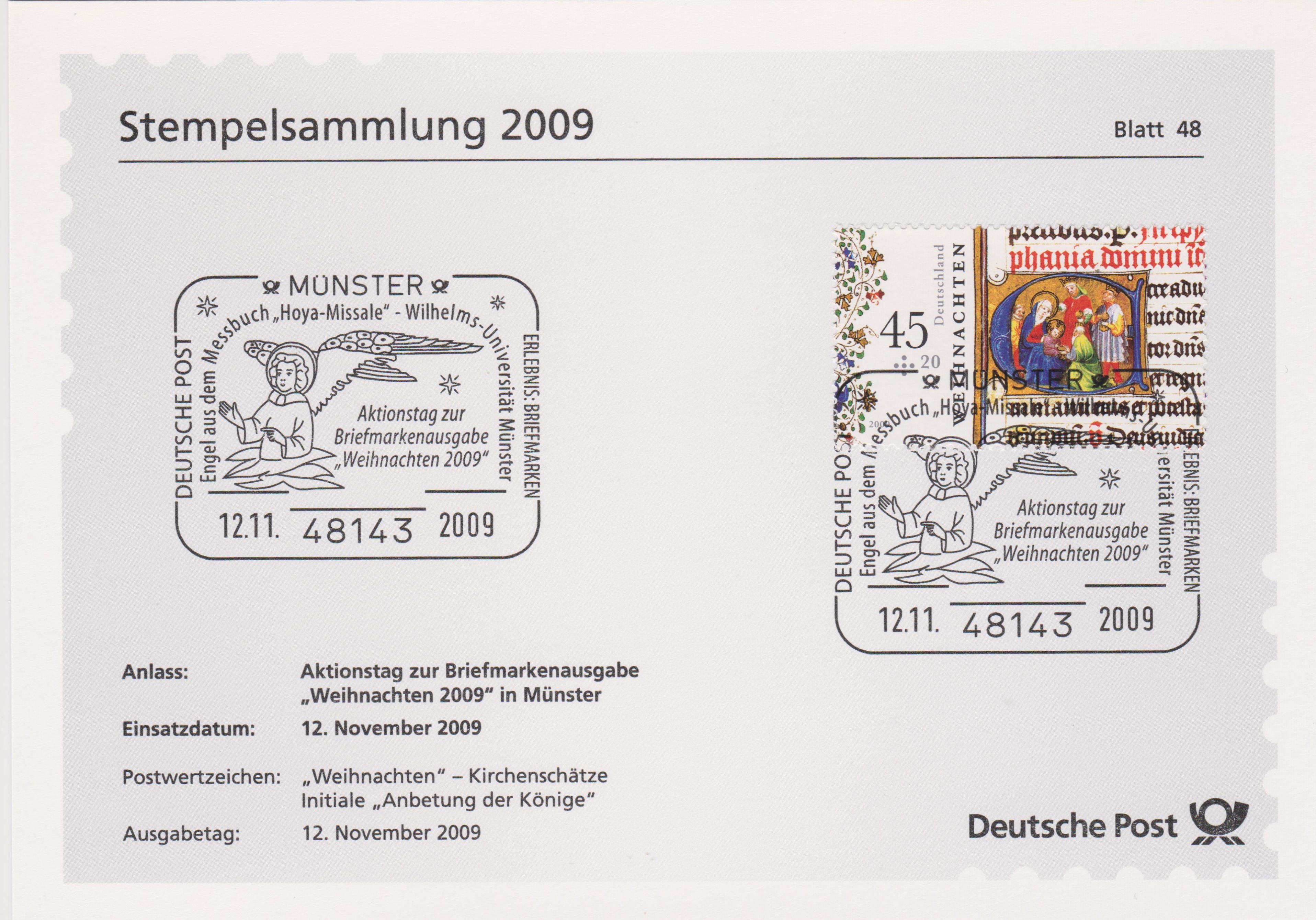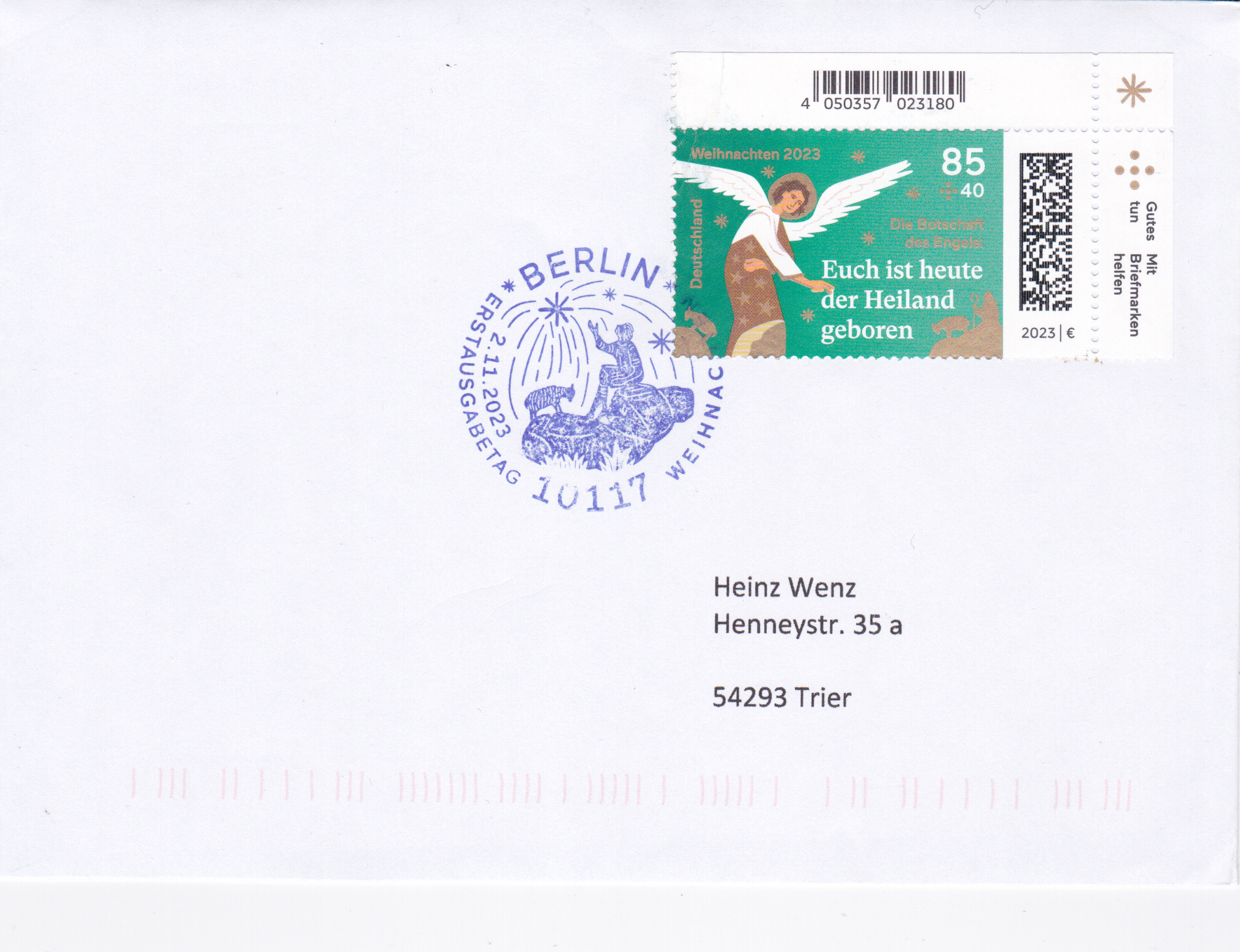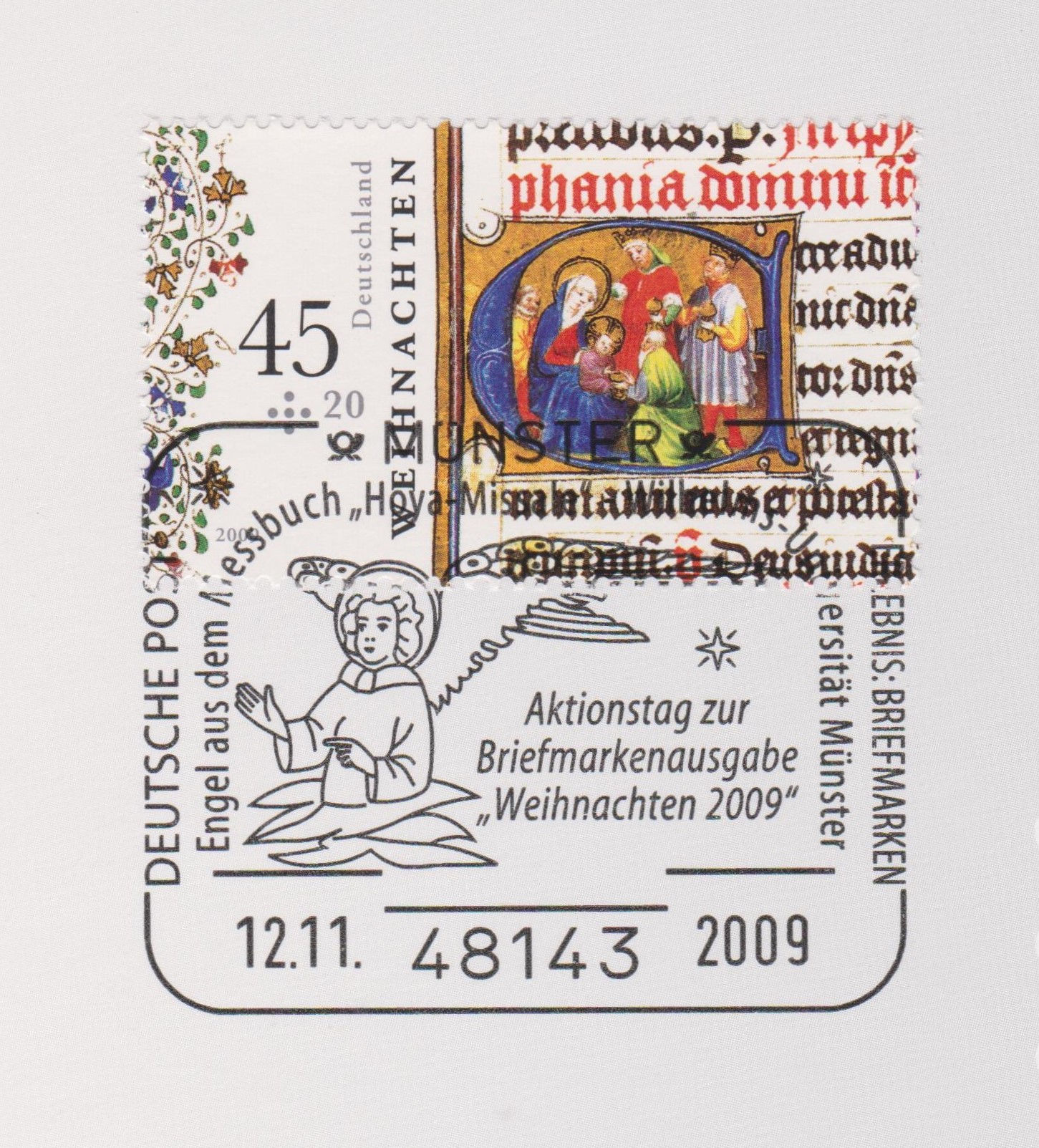 Die Weihnachtsmarke 2023 der Deutschen Post (MiNr 3793) zum Thema "Botschaft des Engels" zeigt die Abbildung "Euch ist heute der Heiland geboren" (Verkündigung an die Hirten) nach einer Miniatur im Perikopenbuch Heinrichs II., entstanden zwischen 1007 und 1012 im Kloster Reichenau.