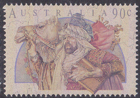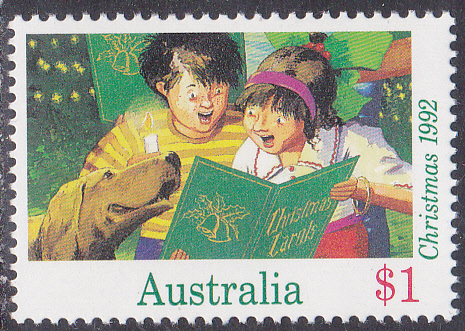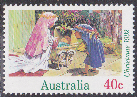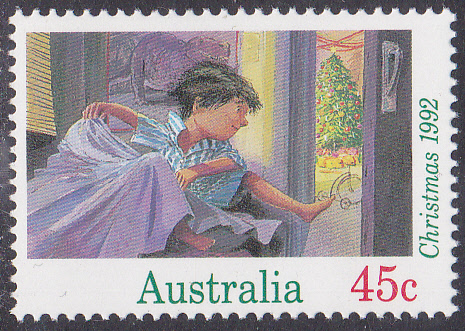 Die Weihnachtsmarke 1991 aus Australien zu 38 Cent zeigt das Motiv "Hirte erblickt den Verkündigungsengel". Hier eine vierseitig gezähnte Marke aus dem Bogen (MiNr 1270 A).