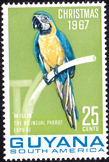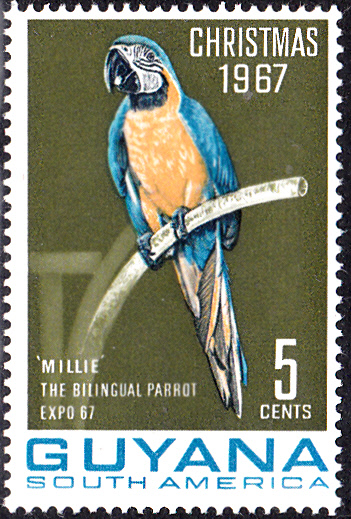 In Guyana sind 1967 zwei Weihnachtsmarken erschienen, die den Gelbbrustara (Ara ararauna) "Millie", ein zwei Sprachen sprechender Papagei, der als Attraktion im Guyana-Pavillon der Weltausstellung "Expo 67" in Montreal zu bewundern war, zeigen. Was das Motiv der Marken mit Weihnachten zu tun hat, kann ich leider nicht sagen.