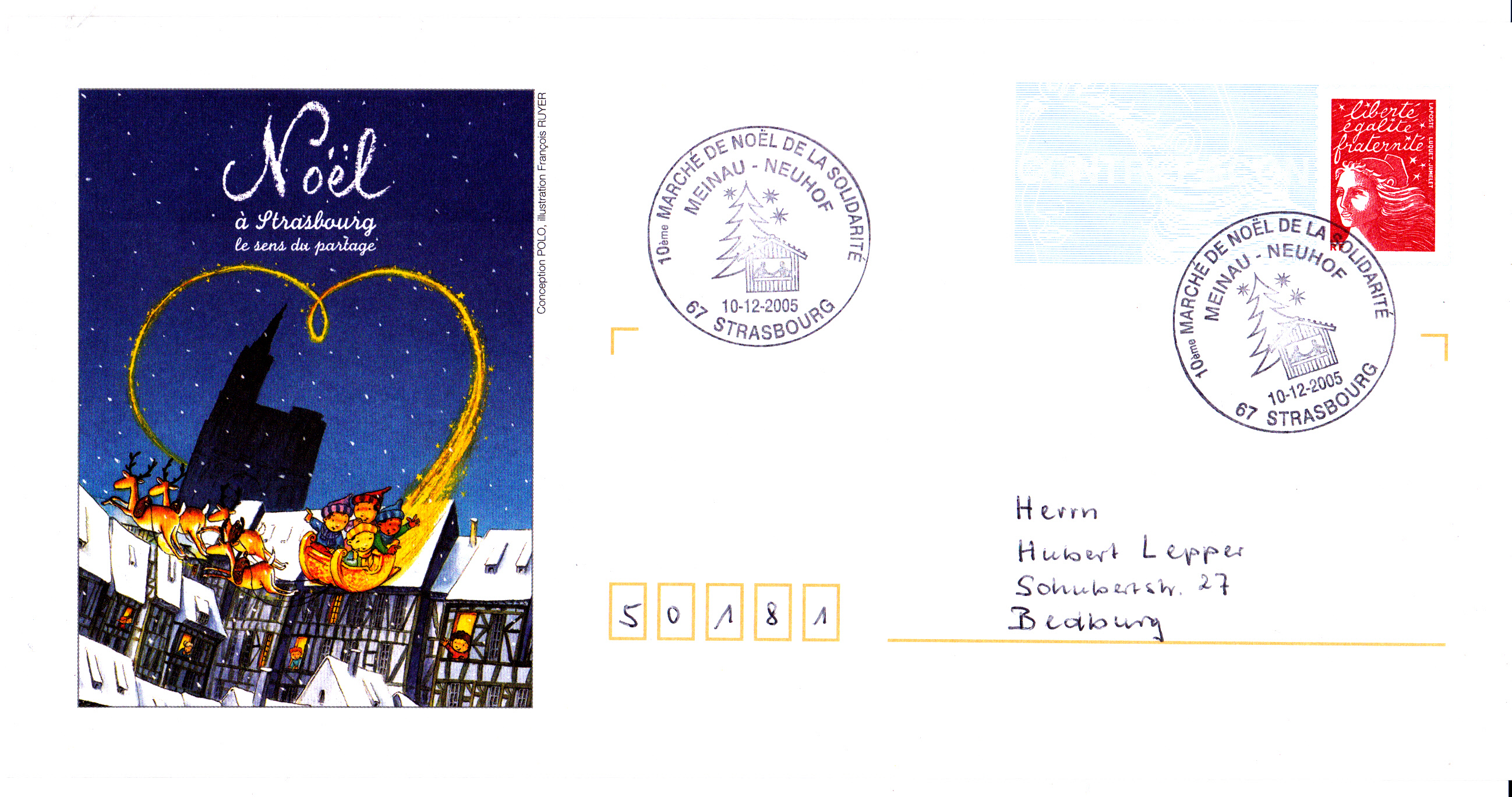 Hier nun eine Ganzsache aus Frankreich (Brief bis 20 Gramm) zum Thema "Weihnachten in Strasburg - der Sinn des Teilens", entwertet mit einem Sonderstempel vom 10.12.2005 zum "10. Weihnachtsmarkt der Solidarität". Im Stempelbild ein Tannenbaum und eine Bude des Weihnachtsmarktes.