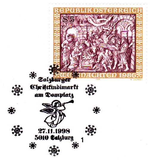 Auch in Salzburg heißt der Weihnachtsmarkt Christkindlmarkt, wie dieser Sonderstempel vom 27.11.1998 aus A-5010 Salzburg zeigt.