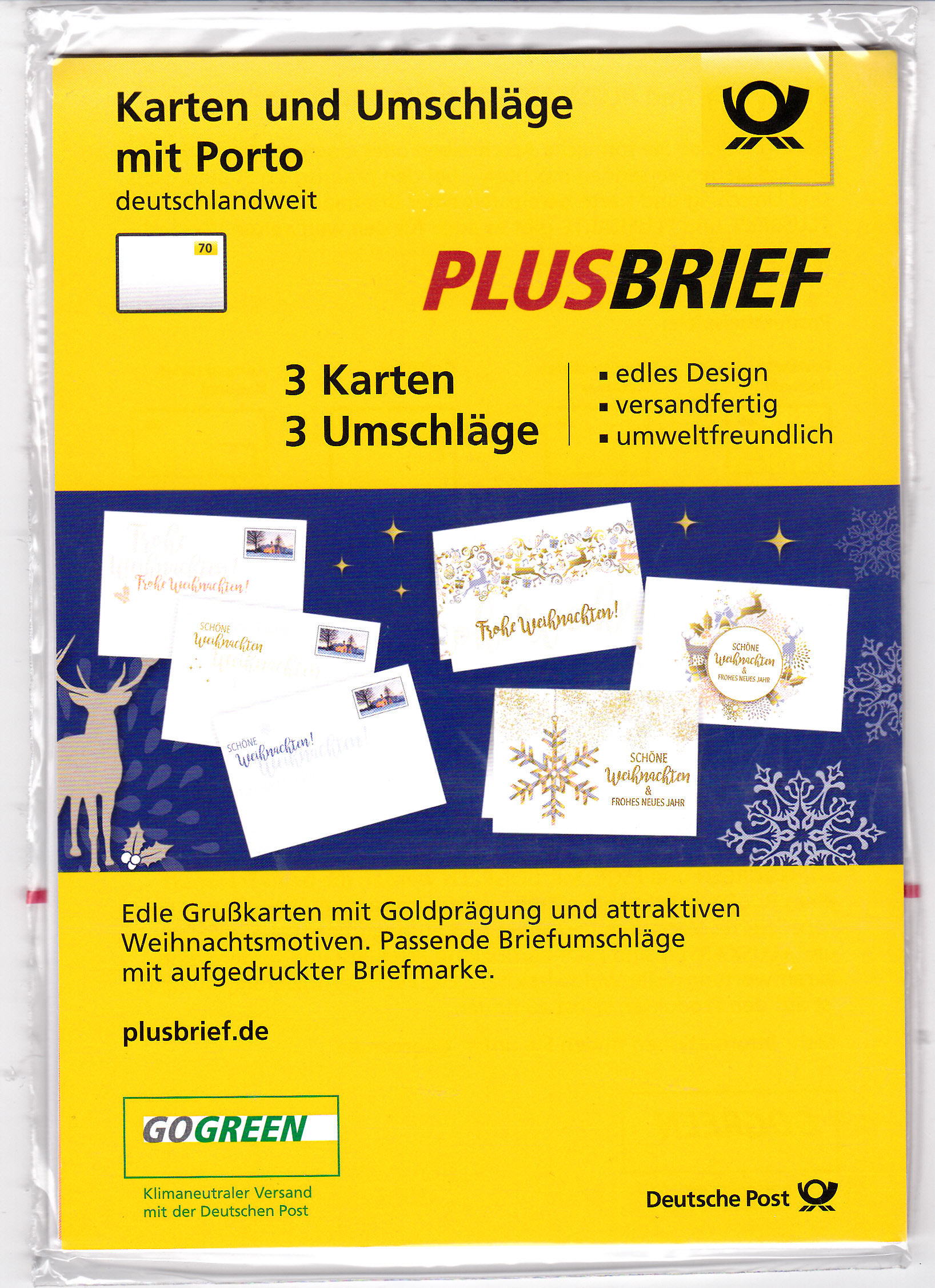 Über die Postfilialen werden "Karten mit Umschlägen mit Porto" verkauft, wie diese Verpackung zeigt: