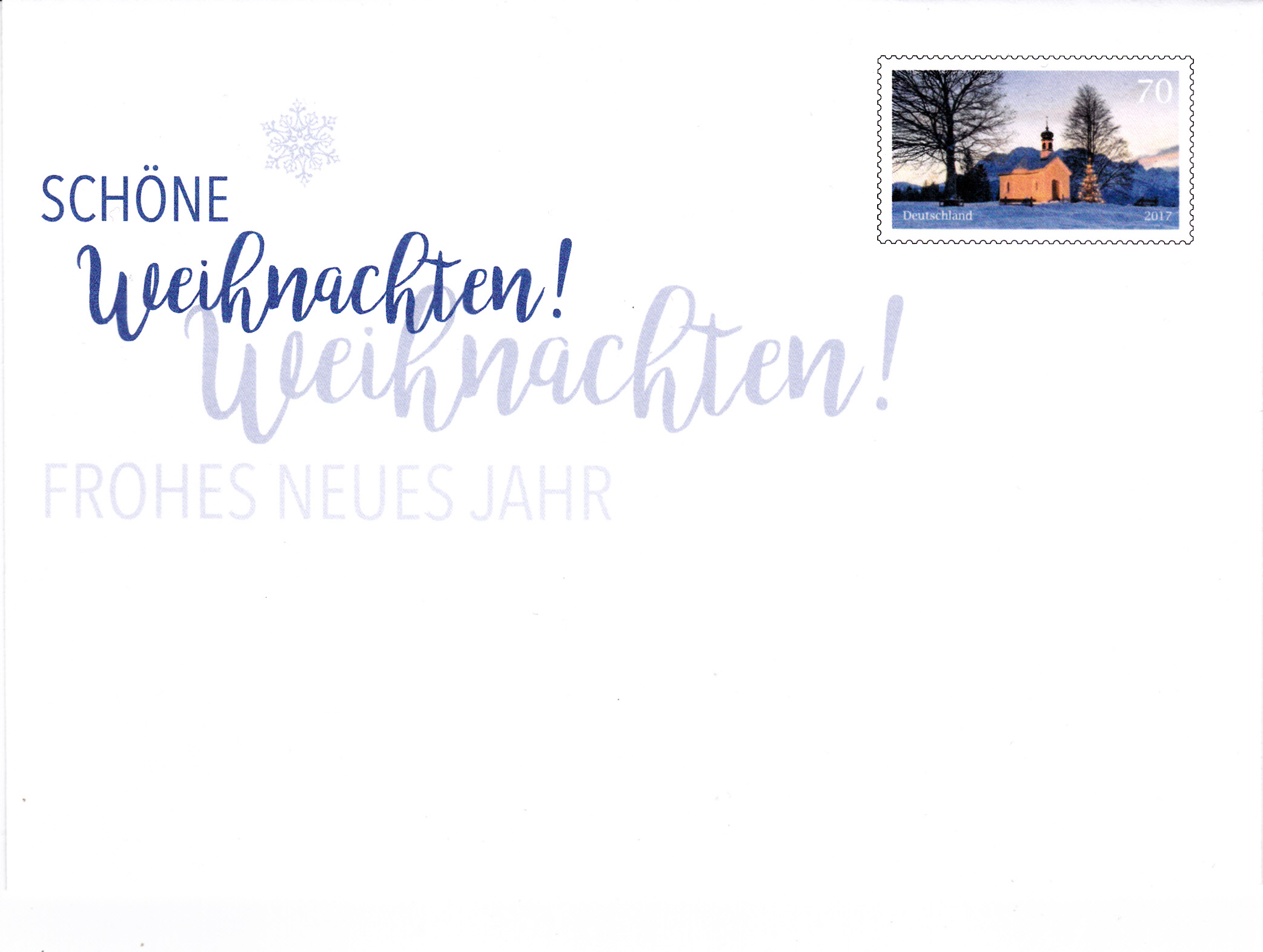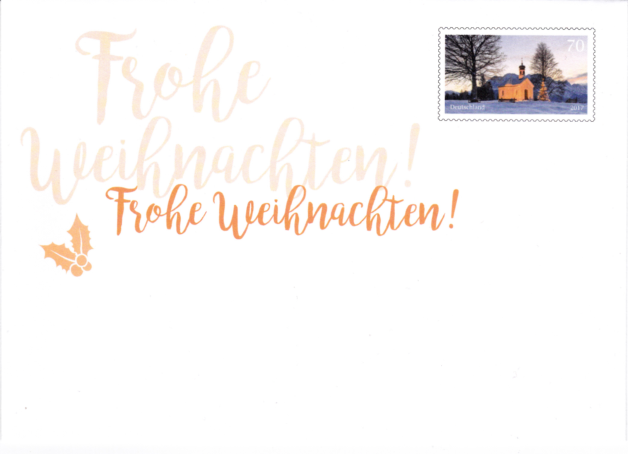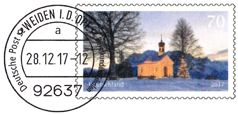 Dieser Ganzsachenumschlag im Format 229 x 114 mm, eine Eigenausgaben der DP AG mit Postlogo "Deutsche Post", hat einen Wertstempel mit der 70 Cent Marke "Weihnachtliche Kapelle". Die Vorausentwertung hat das Datum "28.12.17-12".