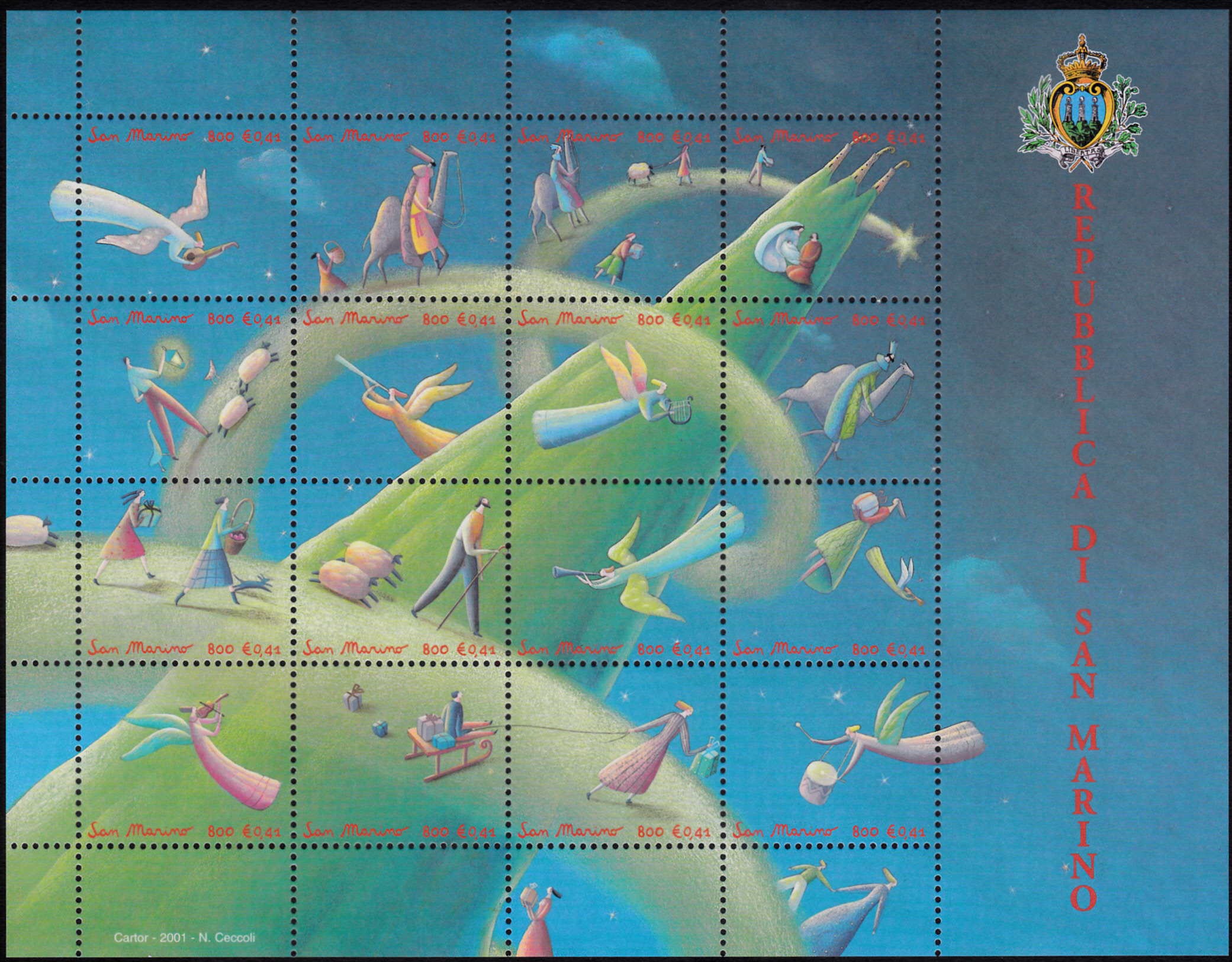 Die gezeigte 16 Weihnachtsmarken sind zusammenhängend in einem Zusammendruckbogen erschienen. Zusammen ergeben sie ein Gesamtbild: das Gemälde "Weihnachten am Monte Titano" von Nicoletta Ceccoli (geb. 1973). Hier der kompletter Bogen: