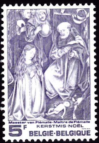 Auf der Weihnachtsmarke 1976 aus Belgien (MiNr 1889) wird "Die Geburt Christi" nach einem Gemälde vom Meister von Flémalle (um 1378-1444) gezeigt.