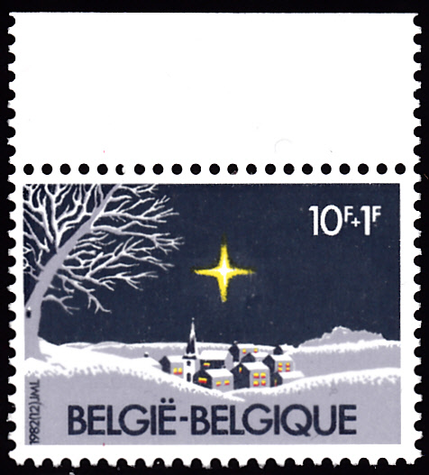 Hier kommt die Weihnachtsmarke aus Belgien (MiNr 2119) aus dem Jahre 1982. Sie zeigt eine Winterlandschaft.