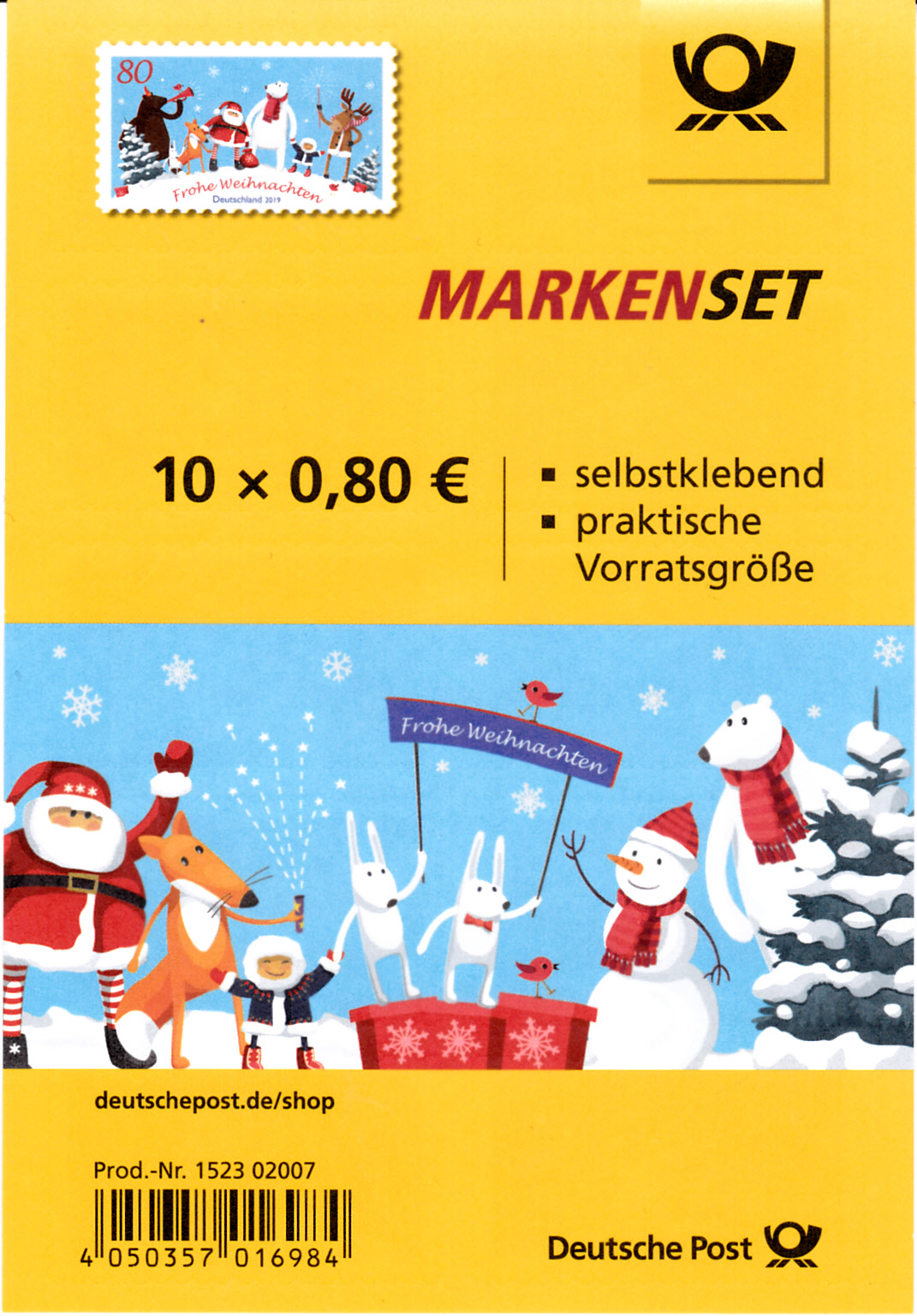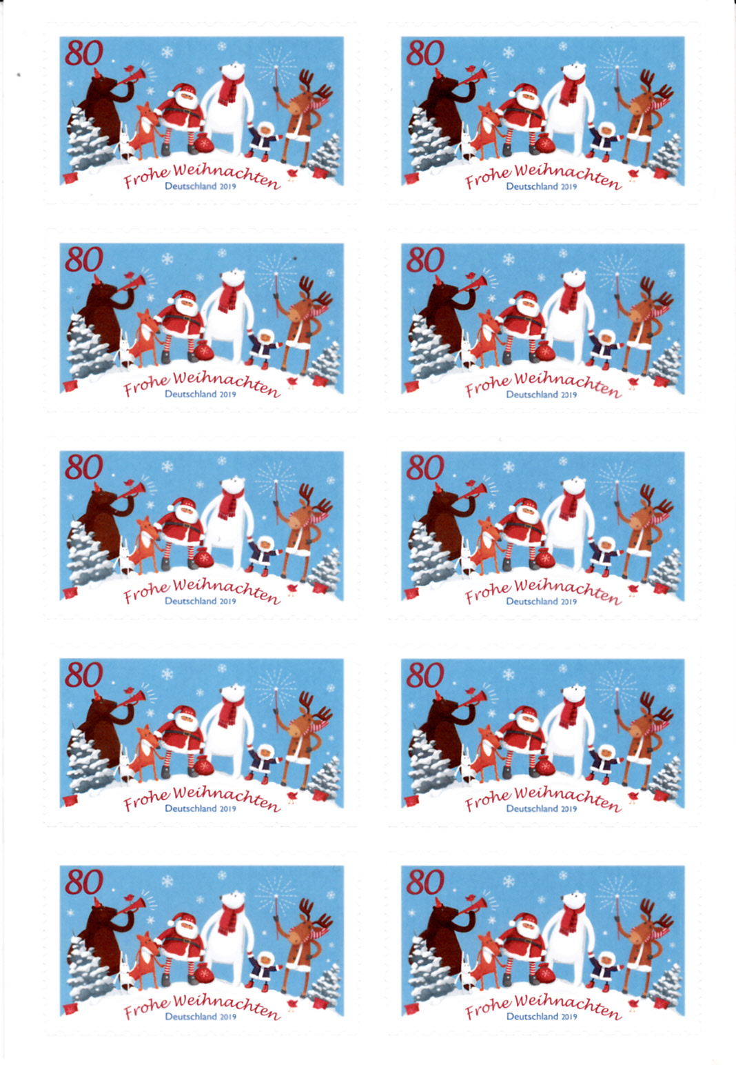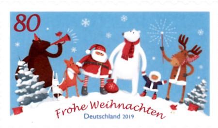 bei der Deutschen Post ist am 2.11.2019 eine Marke zum Thema "Weihnachten mit Freunden" (MiNr 3504) erschienen. Der Weihnachtsmann, der Eisbär und das Eskimokind feiern im Markenbild gemeinsam mit den Tieren des Waldes das Weihnachtsfest. Hier zeige ich eine Marke vom Eckrand mit EAN-Codierung.