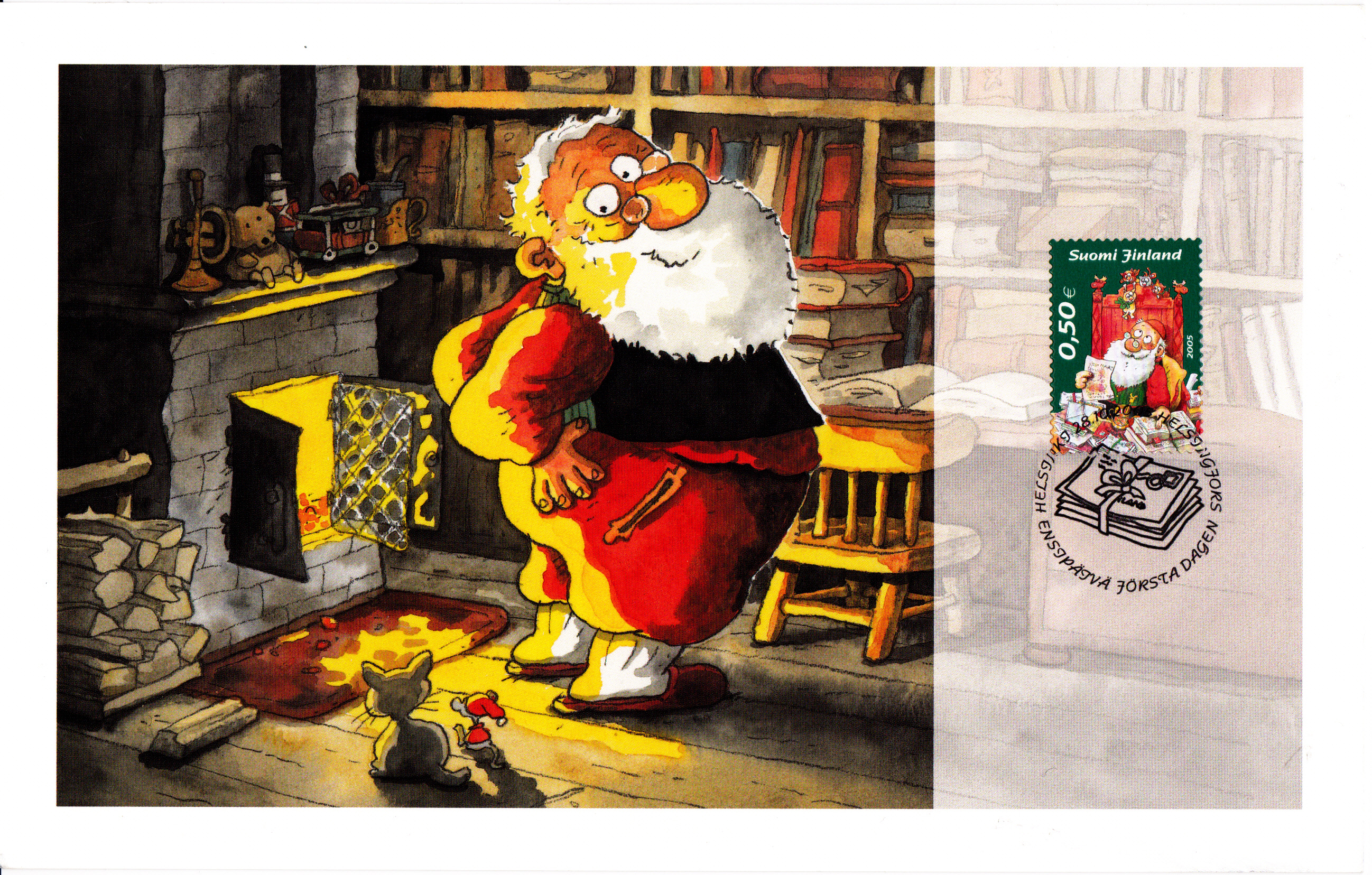 Diese Weihnachtsmarke 2005 aus Finnland (MiNr 1769) zeigt uns einen Weihnachtsmann, der Wunschbriefe liest. Im Ersttagssonderstempel sehen wir ein ganzes Bündel Wunschbriefe.