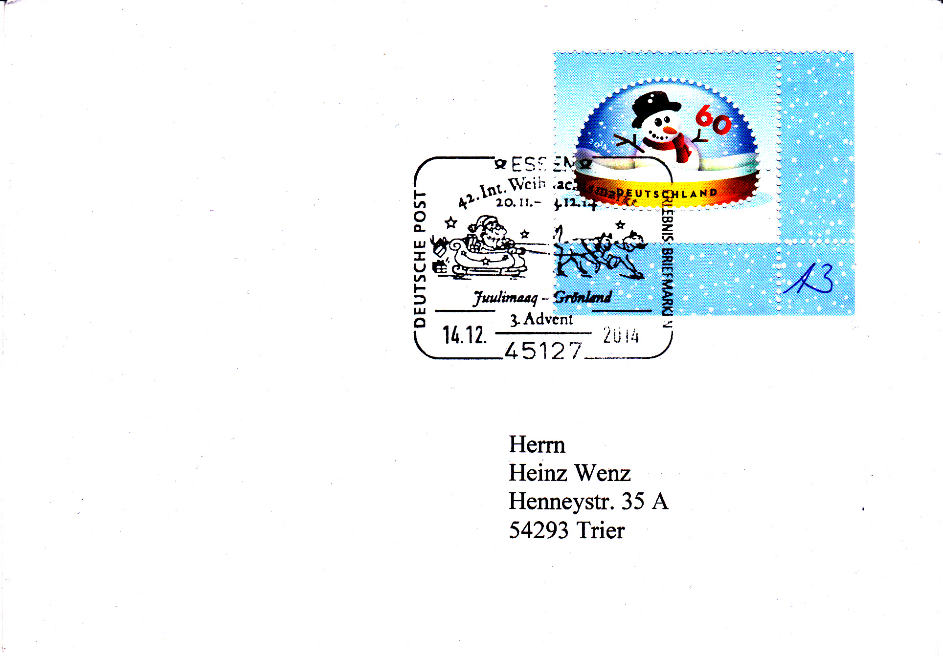 In Grönland heißt der Weihnachtsmann "Juulimaaq", wie uns dieser Sonderstempel zum Weihnachtsmarkt in Essen vom 14.12.2014 lehrt.
