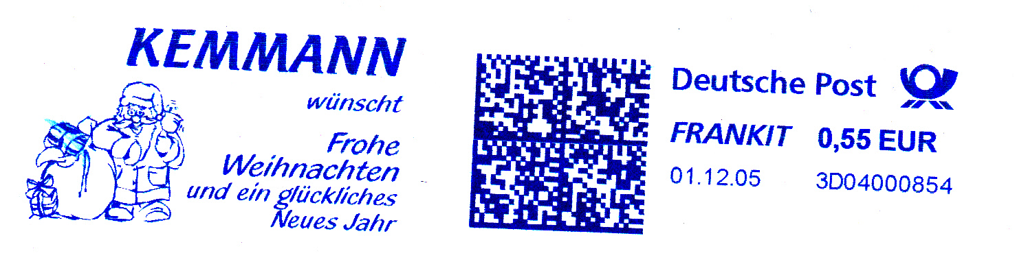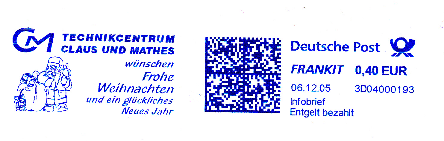 Diese FRANKIT-Frankierstempel der Deutschen Post vom 6.12.2005 und vom 1.12.2005 zweier Firmen zeigen im Werbeeinsatz jeweils einen Weihnachtsmann. Offenbar hatte die Firma Francotyp-Postalia (Hersteller-Kennung 3D) dieses Motiv "im Angebot".