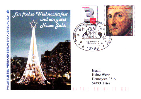 Hier noch ein Weihnachtsmann im Sonderstempel vom 18.12.2013 aus 16798 Himmelpfort. Himmelpfort ist ein staatlich anerkannter Erholungsort im Norden des Landes Brandenburg und Ortsteil der Stadt Fürstenberg/Havel und nicht zu verwechseln mit Himmelpforten, einer Gemeinde im Landkreis Stade. Der Stempel ist auf einem Ganzsachenumschlag mit Zudruck des Landesverbandes Berlin-Brandenburg abgeschlagen