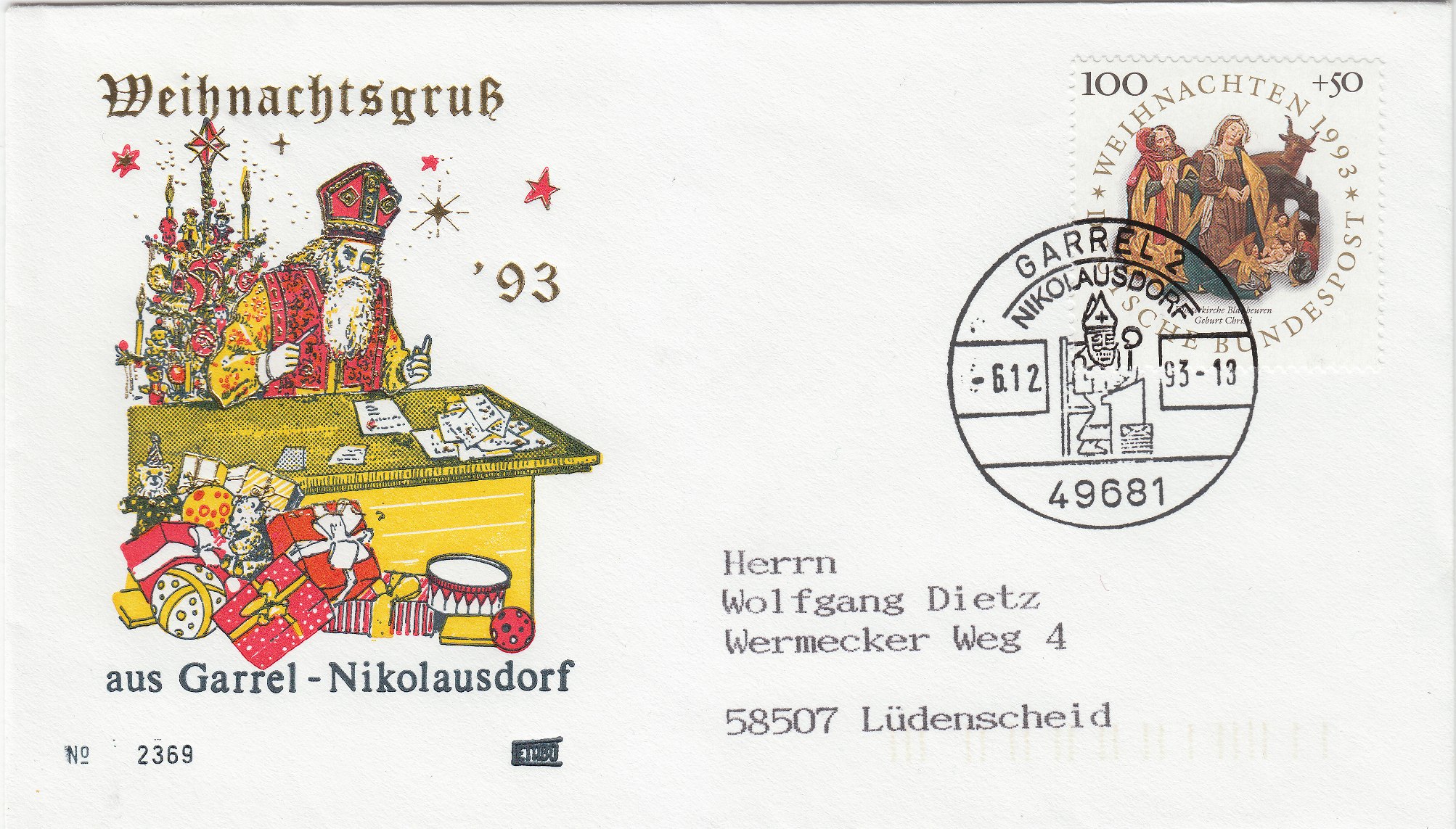 Zum Nikolaustag 06.12.1993 wurde bei diesem Weihnachtsgruß ein passender Stempel in Garrel-Nikolausdorf mit der Darstellung des Heiligen Nikolaus abgeschlagen: