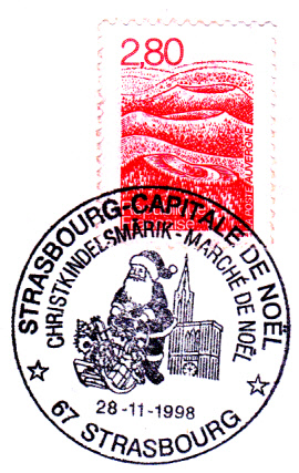 Sonderstempel vom 28.11.1998 aus F-67 Strasburg zum dortigen Christkindelsmarkt mit einem Weihnachtsmann mit Spielzeug vor dem Straßburger Münster.