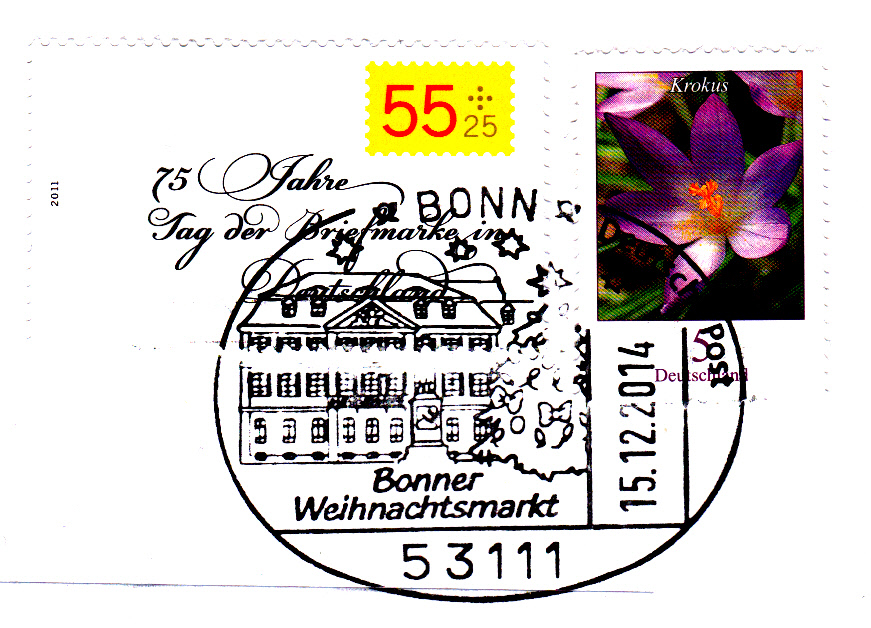 Sonderstempel zum Bonner Weihnachtsmarkt vom 15.12.2014. Leider fällt keinem in Bonn ein anderes Motiv ein, als immer wieder dieses zu benutzen (Siehe unter "Der Weihnachtsbaum" dort sind bereits zwei bildgleiche Stempel aus anderen Jahren zu sehen).