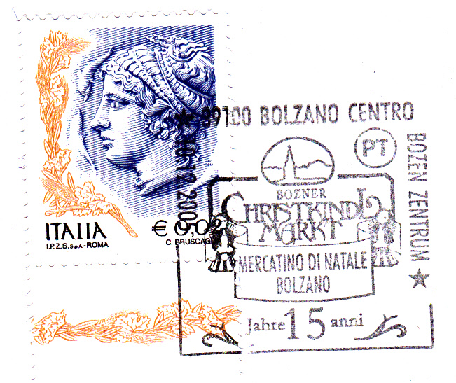 Sonderstempel aus I-39100 Bozen Zentrum vom 10.12.2005 zu 15 Jahre Bozner Christkindlmarkt.