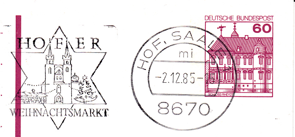 Maschinenwerbestempel vom 2.12.1985 zum Hofer Weihnachtsmarkt.