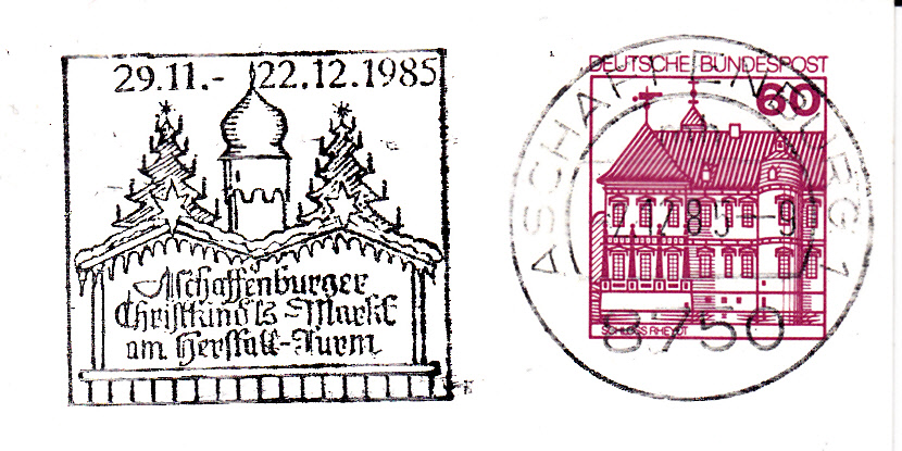 Maschinenwerbestempel zum Aschaffenburger Christkindls-Markt 1985. Im Werbeeinsatz sind Buden des Christkindls-Marktes und Weihnachtsbäume abgebildet.