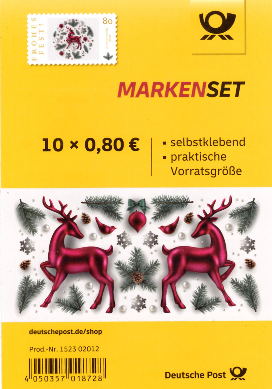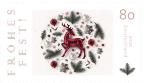 Seit ein paar Jahren gibt es bei der Deutschen Post AG auch eine Marke mit weihnachtlicher Darstellung ohne Zuschlag. Im Jahr 2020 erschien diese Marke (MiNr 3573) unter dem Titel "Frohes Fest". Sie zeigt einen Glashirsch, eine Christbaumkugeln, Tannenzweige, Schneeflocken und Lametta.