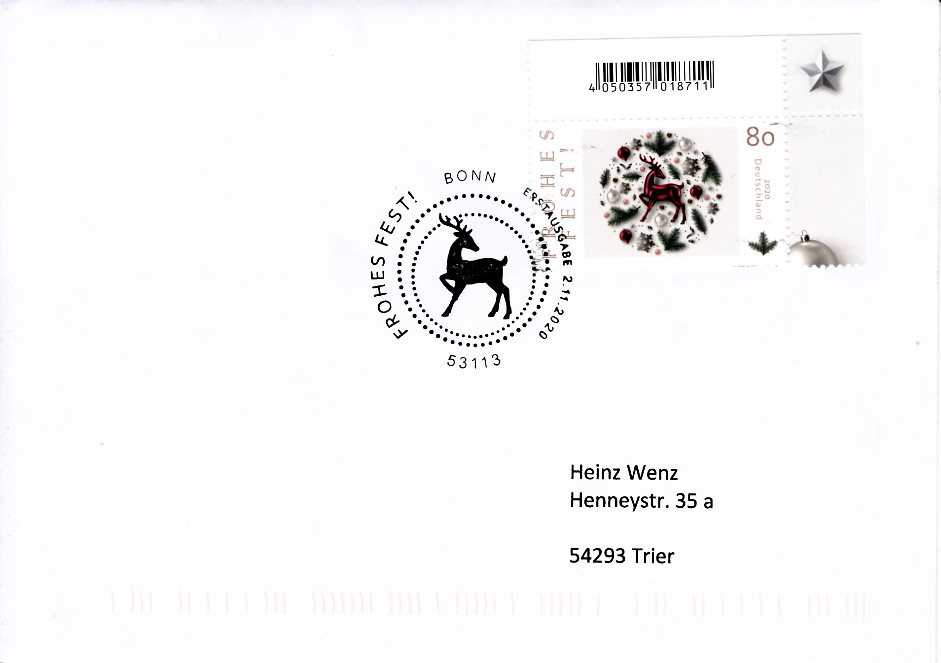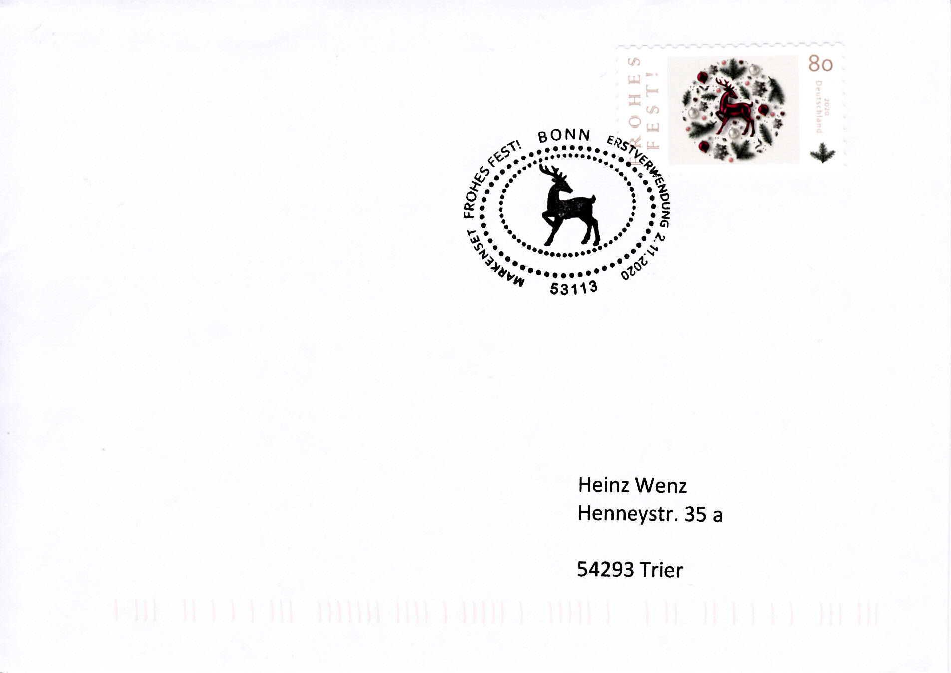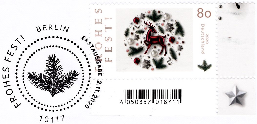 Auf diesem Brief wurde die nassklebende Marke "Frohes Fest" am 1.12.2020 in Berlin mit einem Stempel "Weihnachtsstimmung" entwertet.