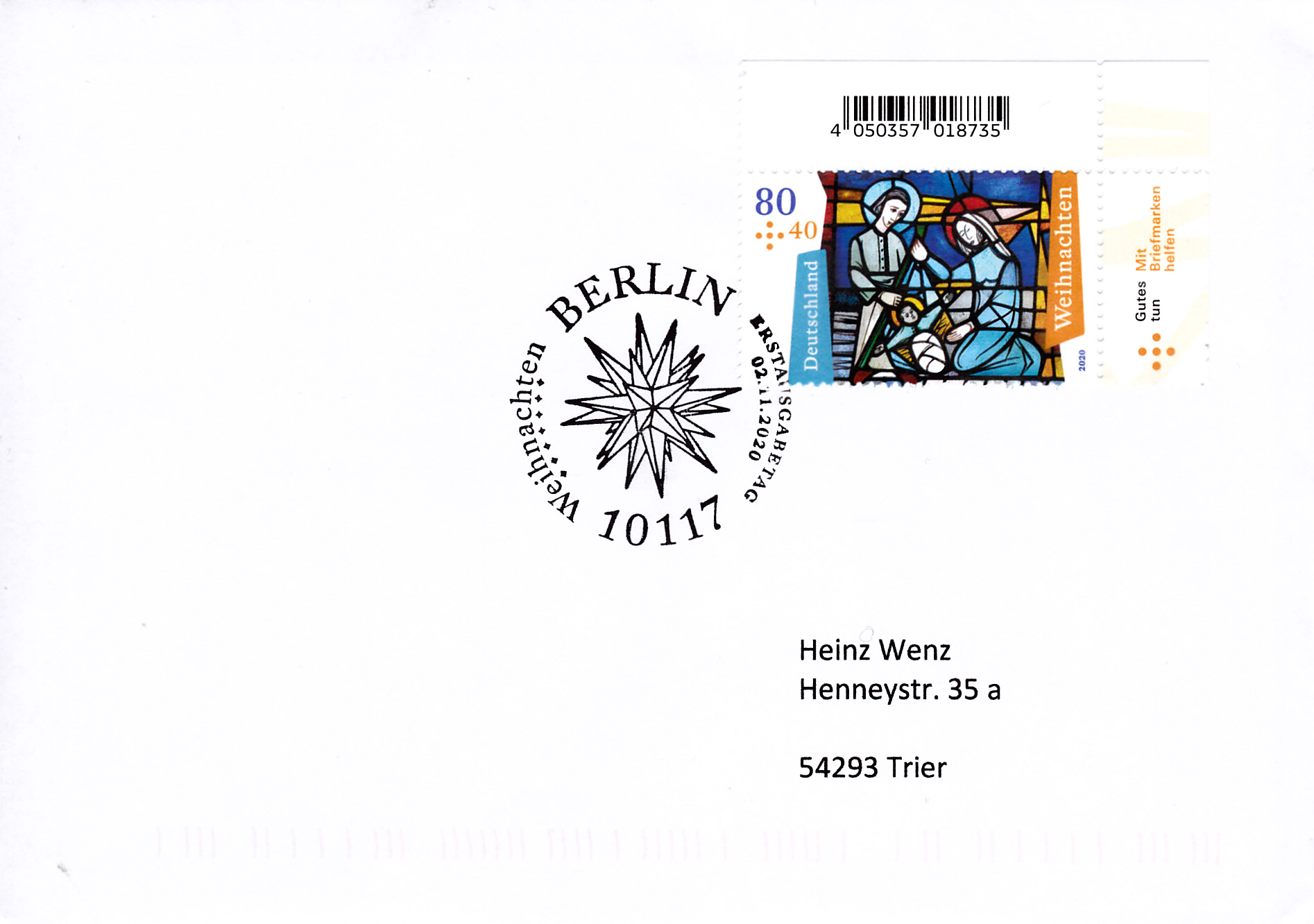 Eine Zuschlagsmarke Weihnachten 2020 (MiNr 3571) wurde auf diesem Brief mit dem Ersttagsonderstempel Berlin gestempelt.