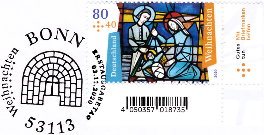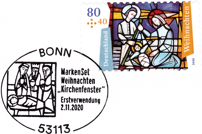 Für die selbstklebende Marke wurde ein eigener Erstverwendungsstempel Bonn eingesetzt. Und, sehr originell, er hat das gleiche Motiv wie der Ersttagsstempel!
