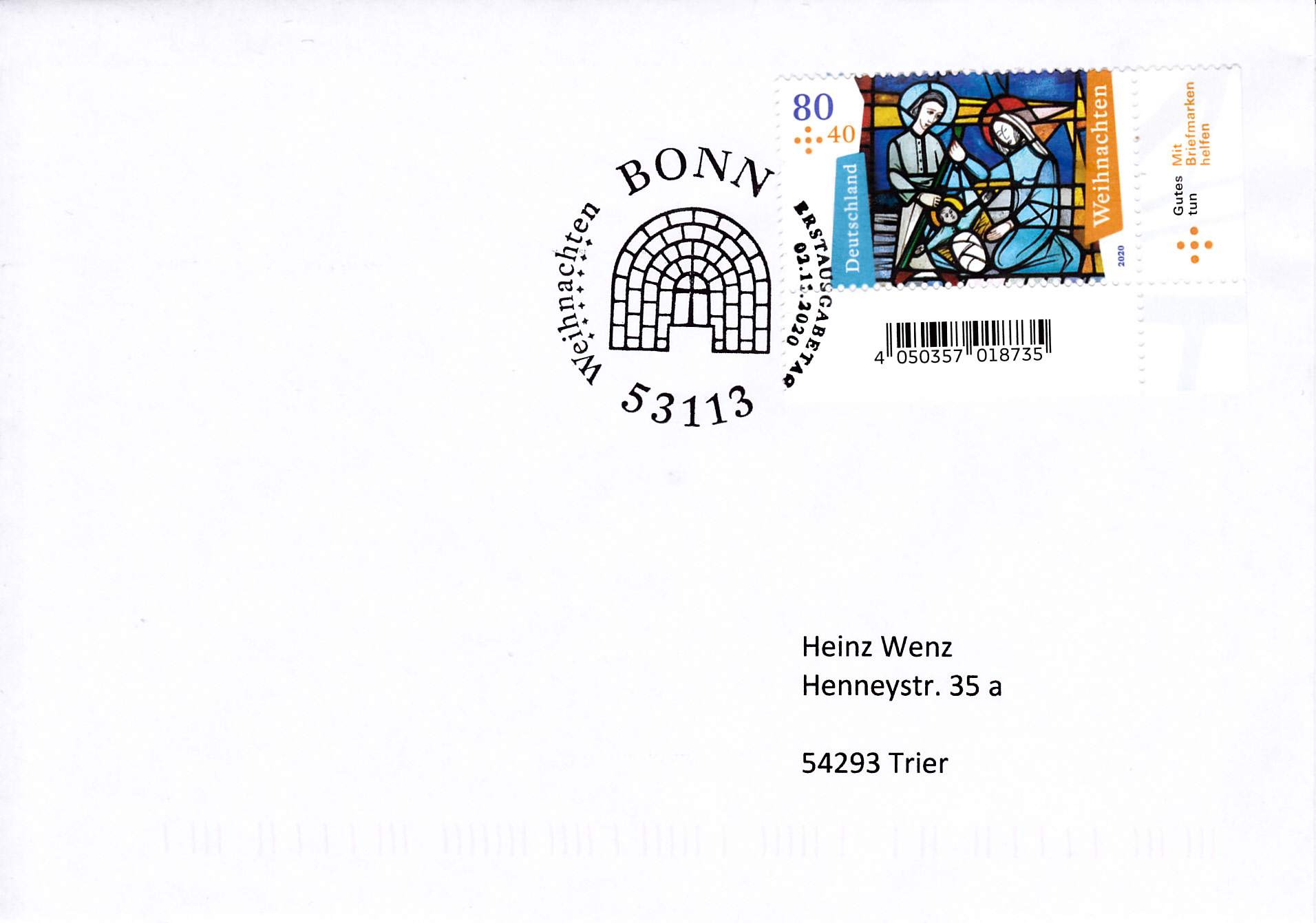 Für die selbstklebende motivgleiche Marke (MiNr 3574) gab es auch einen Erstverwendungsstempel Bonn, der auf diesem Brief abgeschlagen wurde.
