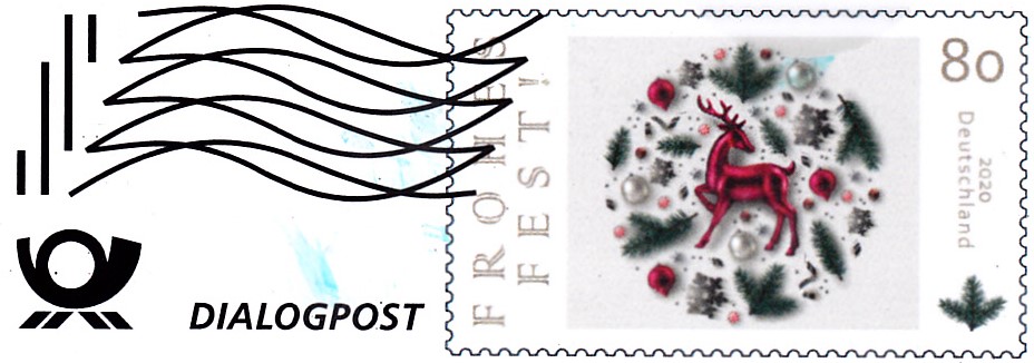 Faltbrief 210 mm x 102 mm mit Wertstempel der 80 Cent-Marke "Frohes Fest" (MiNr 3492) mit aufgedruckter Zähnung. Der Wertstempel ist mit einer Welle "Dialogpost" entwertet.