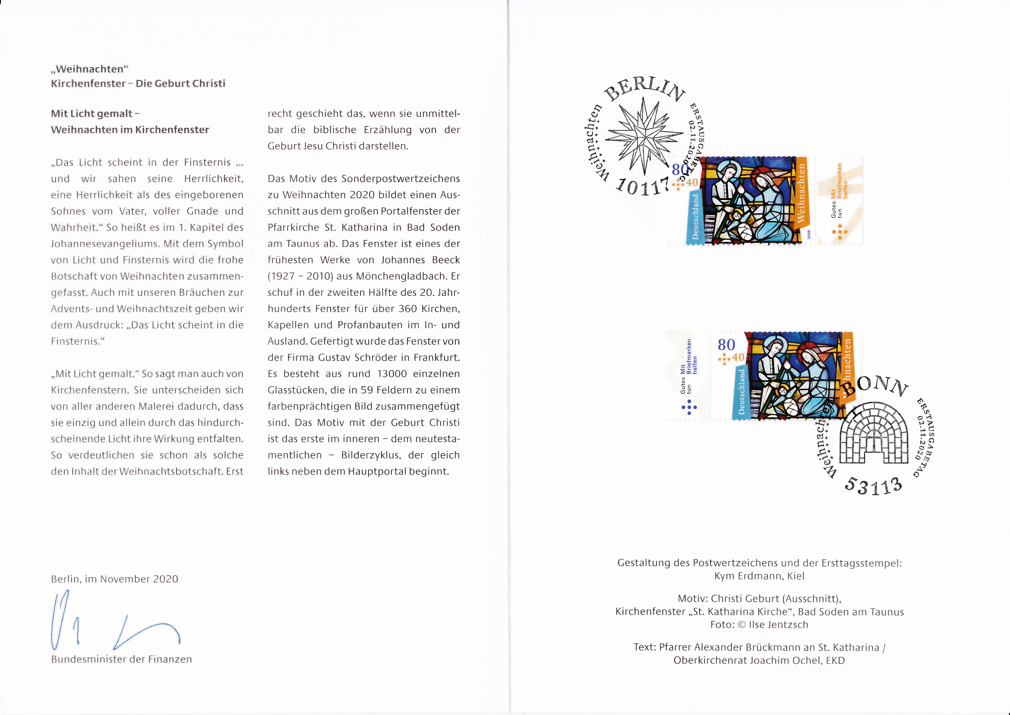 Ministerkarte des Finanzministers mit zwei Marken "Weihnachten" 2020 (MiNr 3571) und mit den Ersttagsonderstempel Berlin und Bonn.